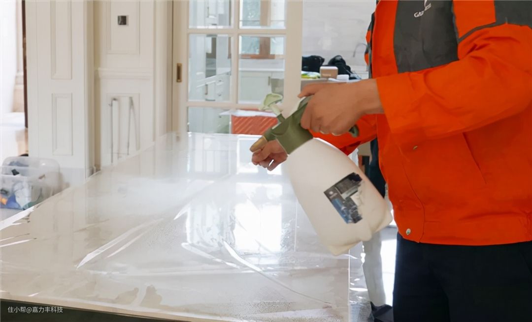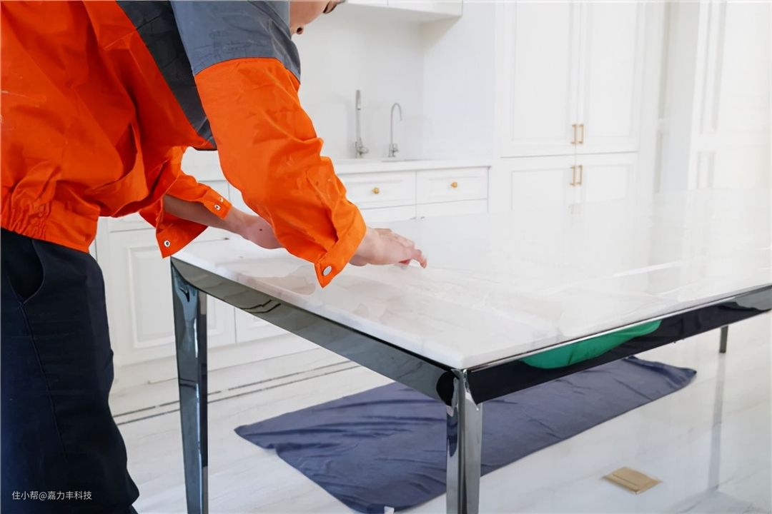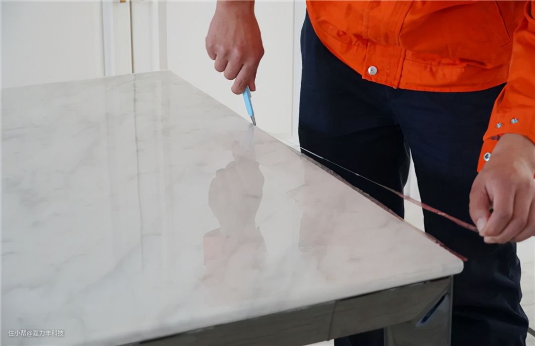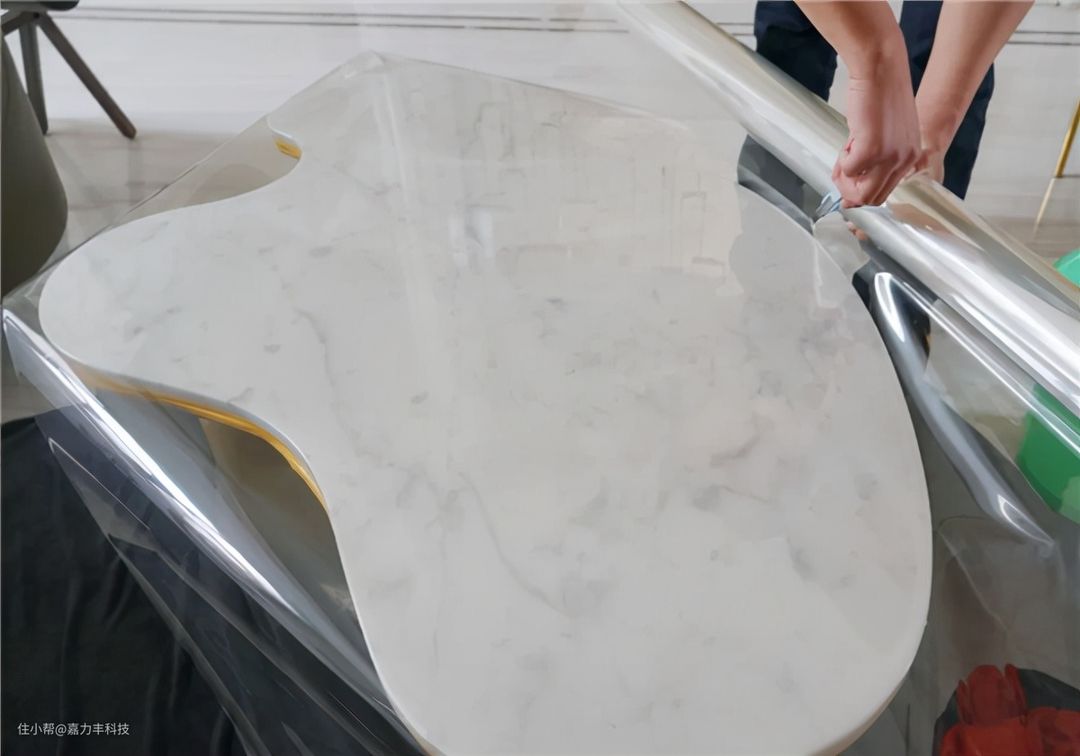 大理石、石英石、玻璃等材质台面,贴硅胶钢化膜;漆面家具、实木家具台面,贴水晶膜;岩板台面贴岩板膜。