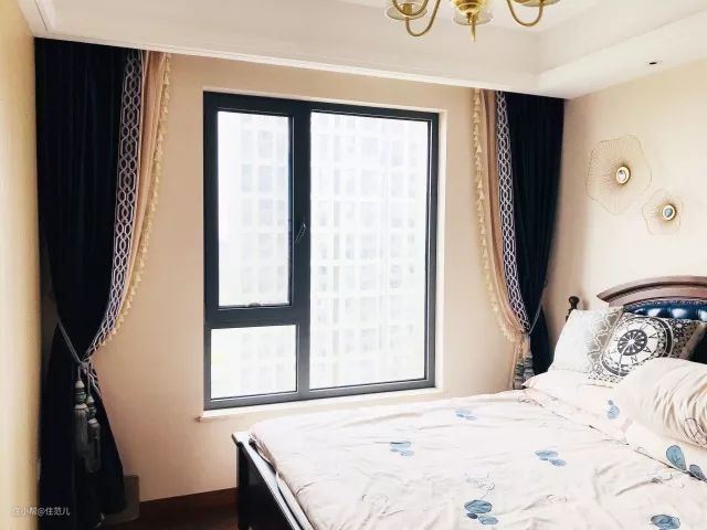 上 这就是上面那款窗帘,但一没做窗帘盒,二长度不够,三倍数不够,这几个坑全踩了,光有全遮光窗帘也没用 图源:浙家布艺专售店
