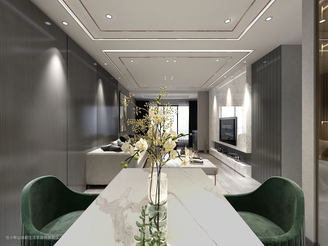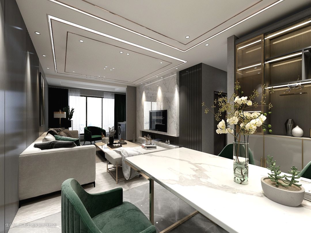 餐厅整体灰色色系,加上墨绿色餐椅,来点亮空间。