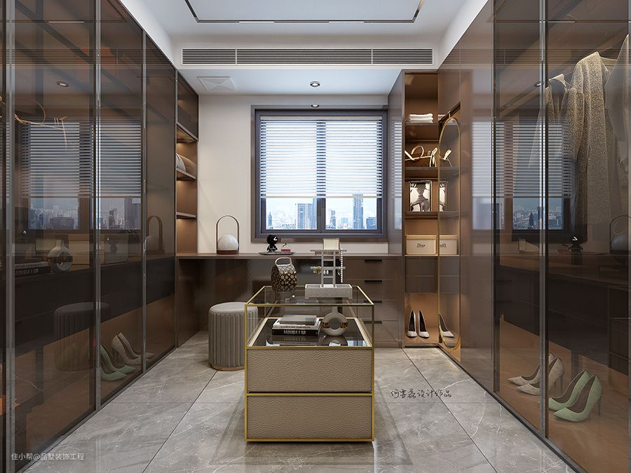 首先进入的衣帽间是以炭灰色玻璃、黄铜元素框架搭配皮纹面板、深咖啡色柜体、绒布面凳子,都是轻奢中的必备元素。