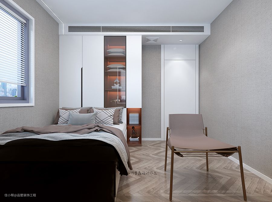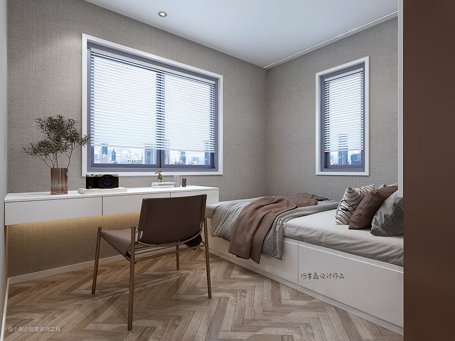 主卧与书房的色调形成鲜明的对比,中性色使得原本平淡无奇的白色房间更具高级感。