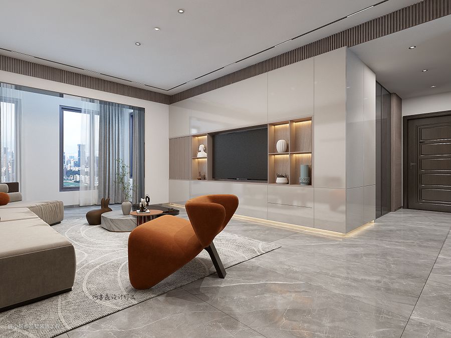 客厅的奶咖色INS风沙发与橙色座椅互相之间产生鲜明的对比,栅格板与平面烤漆板互相产生鲜明的对比。
