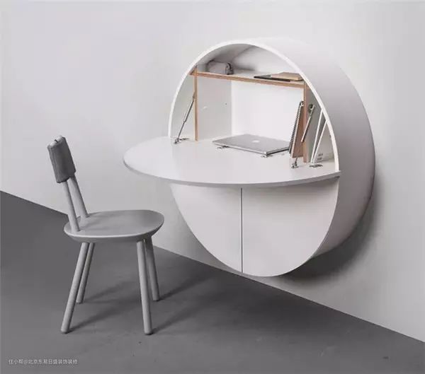 这款单门的可折叠的多功能壁柜,它只占用 40×12×40 厘米的空间,却可以在诸多功能中自由选择或转换,比如梳妆台、小酒柜、药箱、甚至是一个壁挂式的小桌子,内部还设有镜子以及贴心的照明。