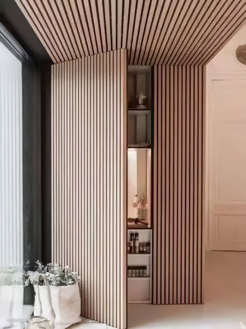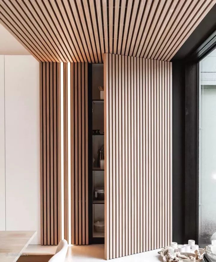 隐藏于木格栅的隐形门更像是一款屏风或者隔断,为室内营造一种隐约的朦胧美。格栅由于其独特的线条,也非常容易达到“隐藏”的效果。木质格栅的凹凸质感能够营造出轻盈的空间氛围,唯一的确定是,其特有的线条和缝隙让它在清理起来相对麻烦。