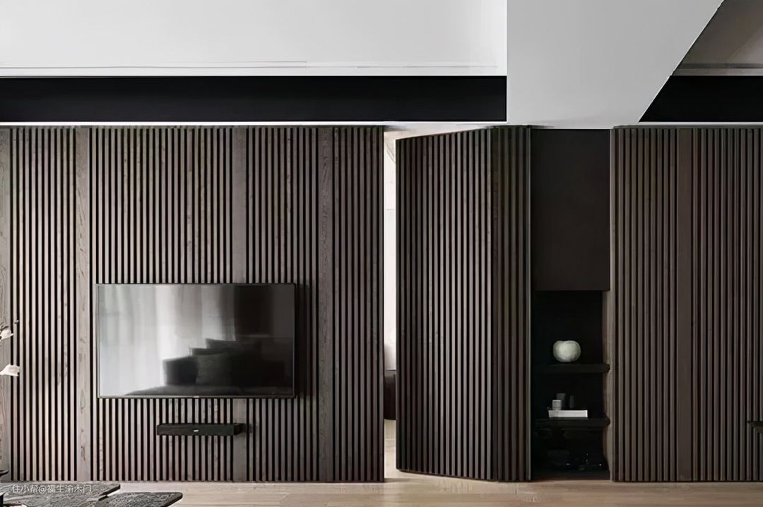 格栅在家装的设计中应用得非常的广泛,例如,沙发墙、电视墙、背景墙。只要是家装墙面,都可以用格栅。看起来高级且低调,尽显轻奢时尚! 格栅+隐形门的做法更为常见,格栅、矩形分割的造型墙最常使用隐形门,将隐形门藏入造型中,也能毫不突兀的区分出私密与公共空间。