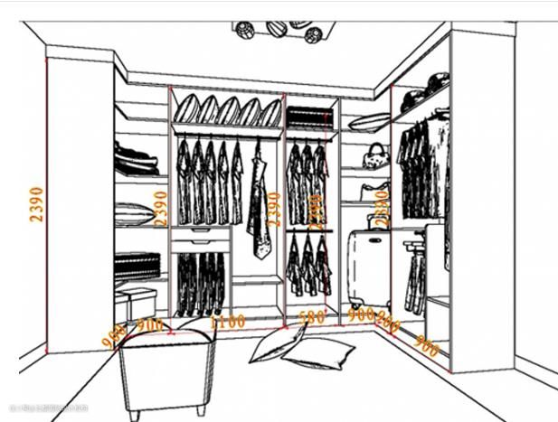 通常情况下,通行过道的宽度,决定了行动的流畅度。对于大多人而言,400mm的过道,人们需要侧着身子过;600mm,可以正常通过,但是蹲下和转身都有点困难;所以建议过道至少宽700mm。所以独立式衣帽间尺寸面积最小应该达到4㎡,一字型、二字型和L型基本在2.5㎡左右即可搞定。