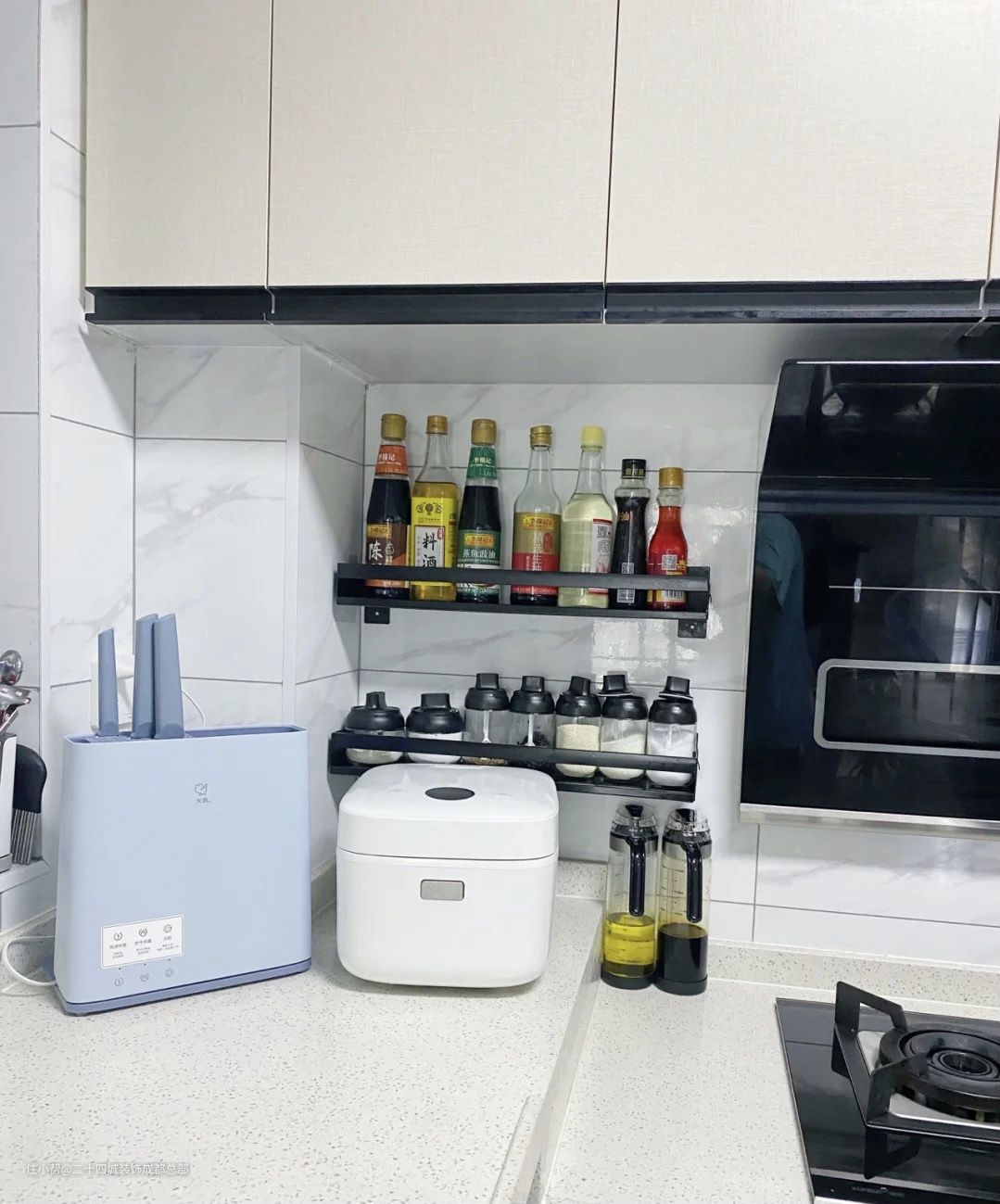 灶台旁设计了黑色的置物架,用于收纳调料品,保持台面的整洁干净,增加收纳空间。