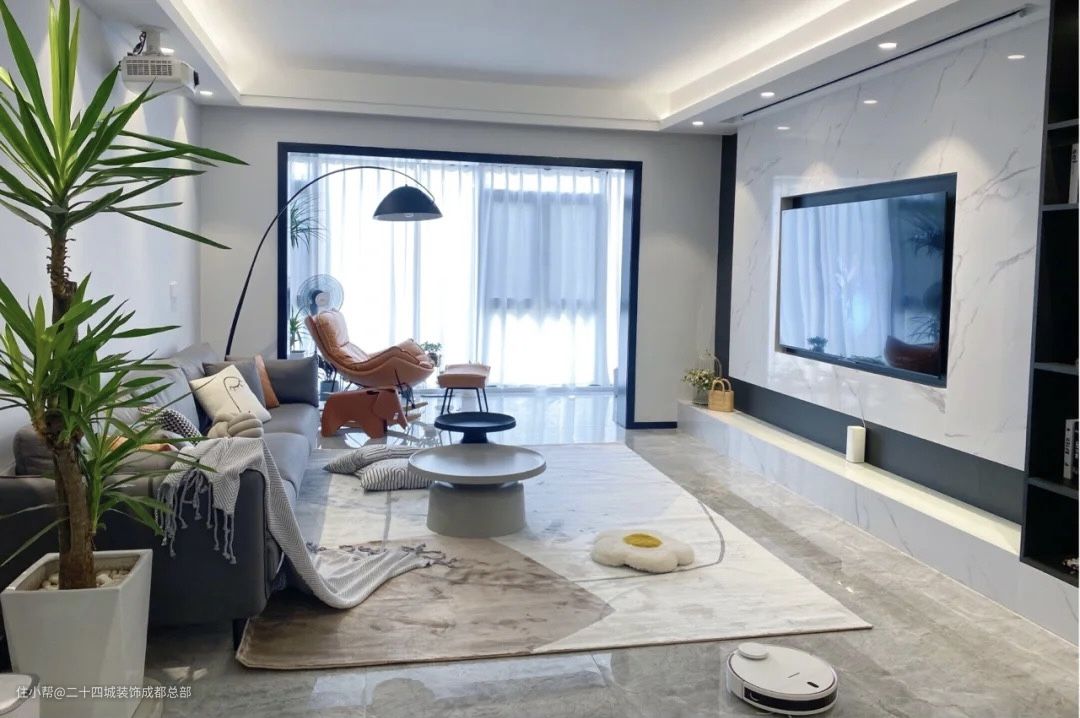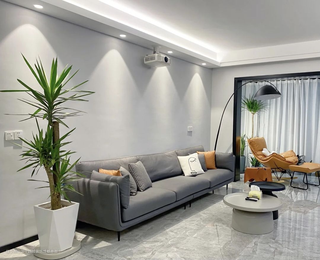 设计了深灰色科技布的沙发,有质感的同时方便打理,沙发左边放置了绿植,烘托出空间的生机与活力,右边搭配黑色钓鱼灯的设计,让整个空间多出一丝趣味与氛围感。