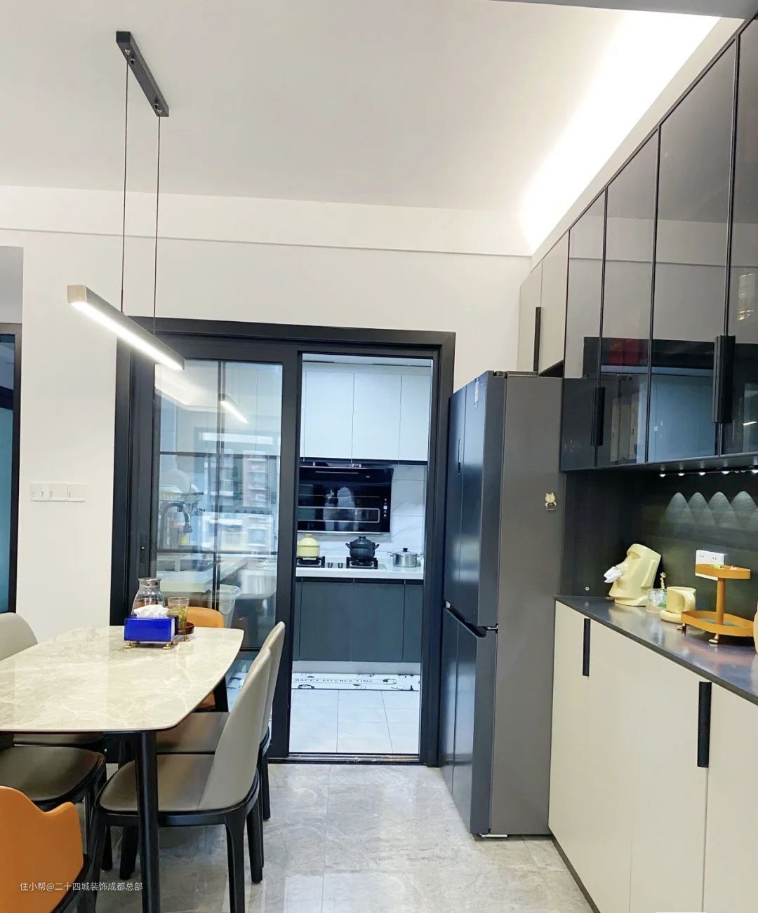 U型的厨房设计,动线合理流畅,与餐厅之间设计了黑色玻璃门进行分区,同时又保留了连接性。