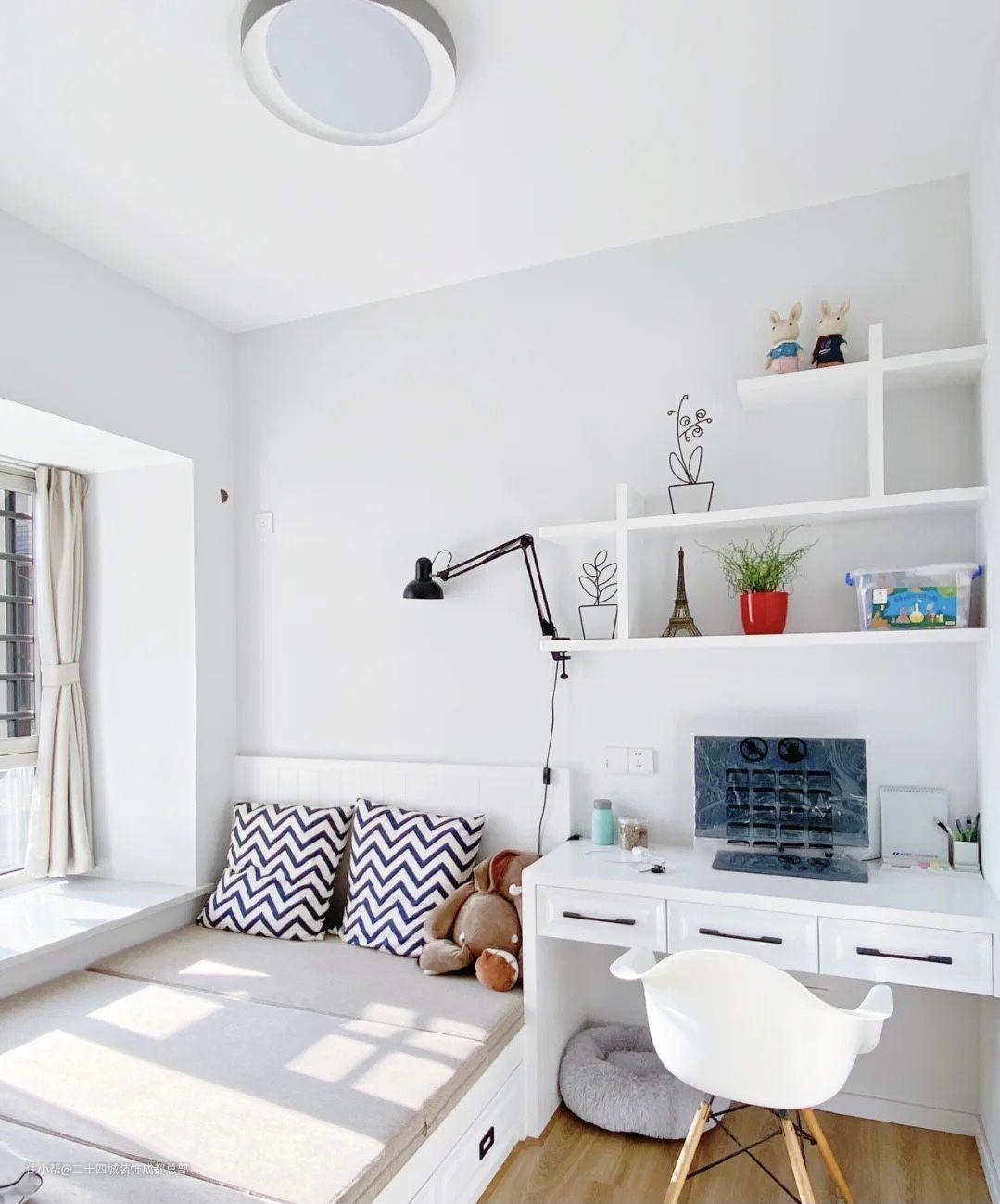 榻榻米房以白色为主,很简洁高级,设计定制了白色的书桌,抽屉搭配了黑色的把手,与整屋相呼应,简洁又高级的经典配色,同时增加了储物空间,书桌上方设计了开放格,不规则的隔板设计,很新颖有特色,隔板上放置了长臂台灯刚好可以满足床头灯的作用,高级又实用。