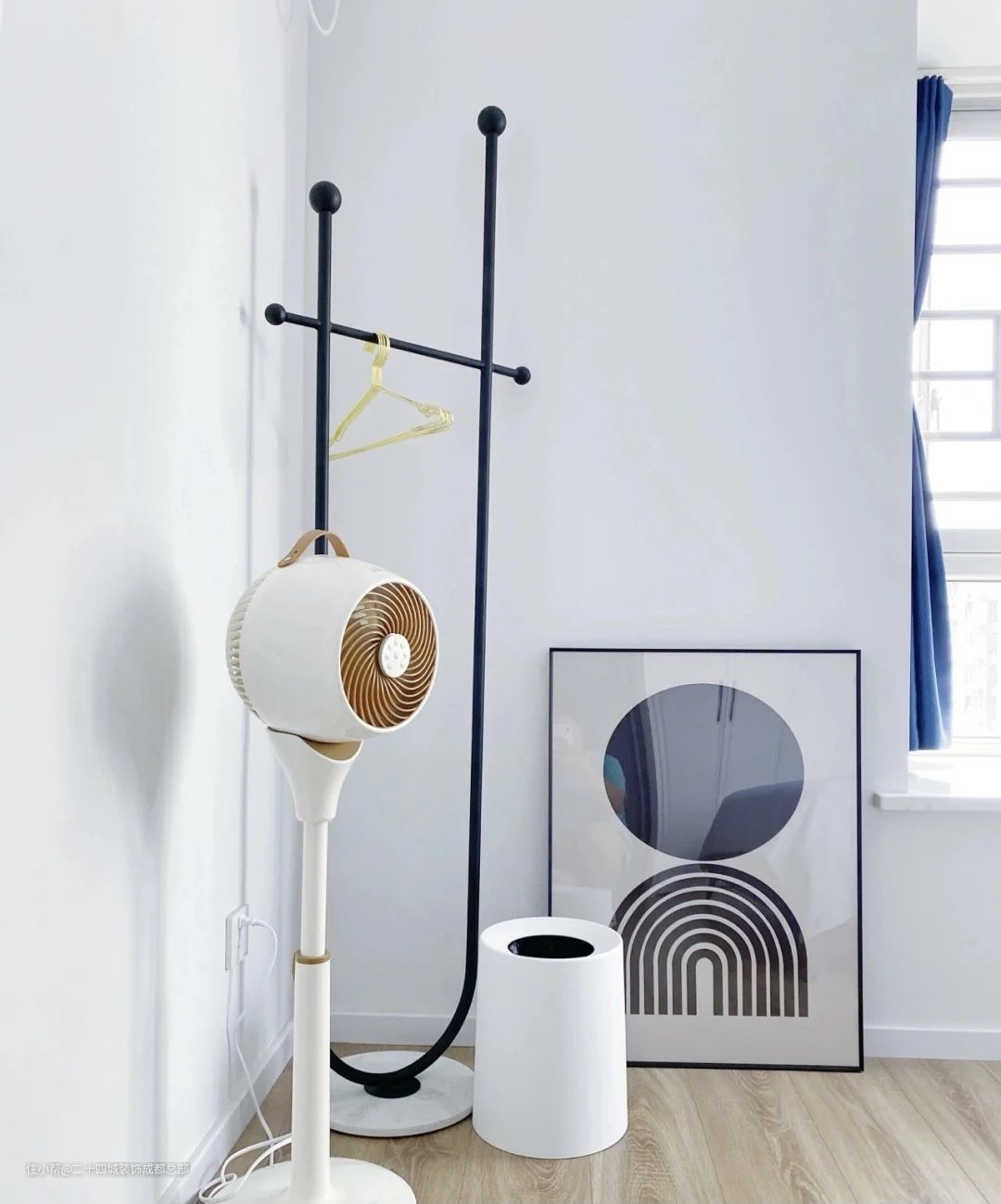 床尾放置了金属晾衣架,独特的造型很新颖,很有趣味,黑色的主体搭配金色的衣架,既高级又优雅。