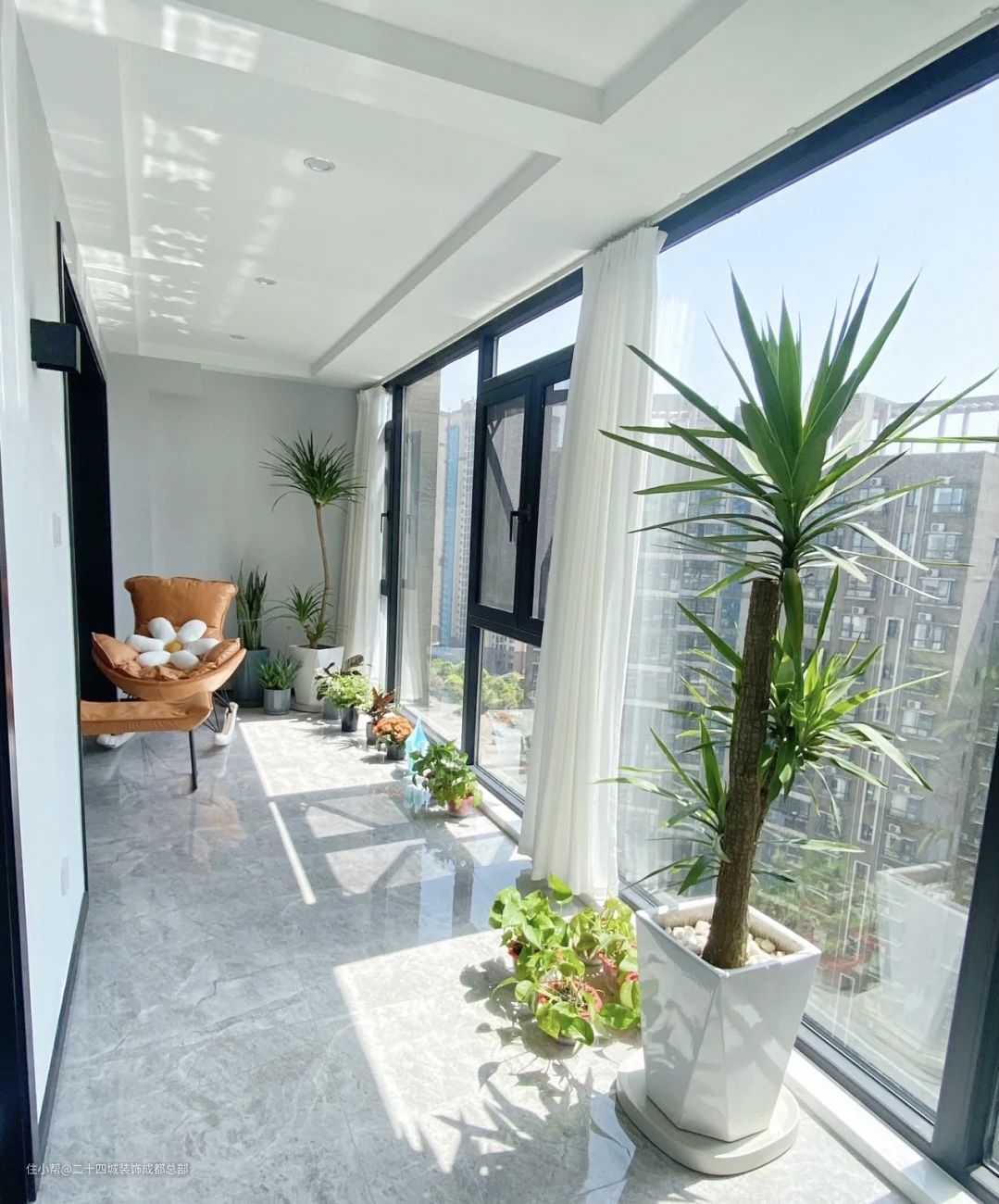 阳台是一条长跑道,设计了落地窗,不仅可以让室内采光效果更好,彰显大气,同时提供了很好的视野,窗外风景一览无余。