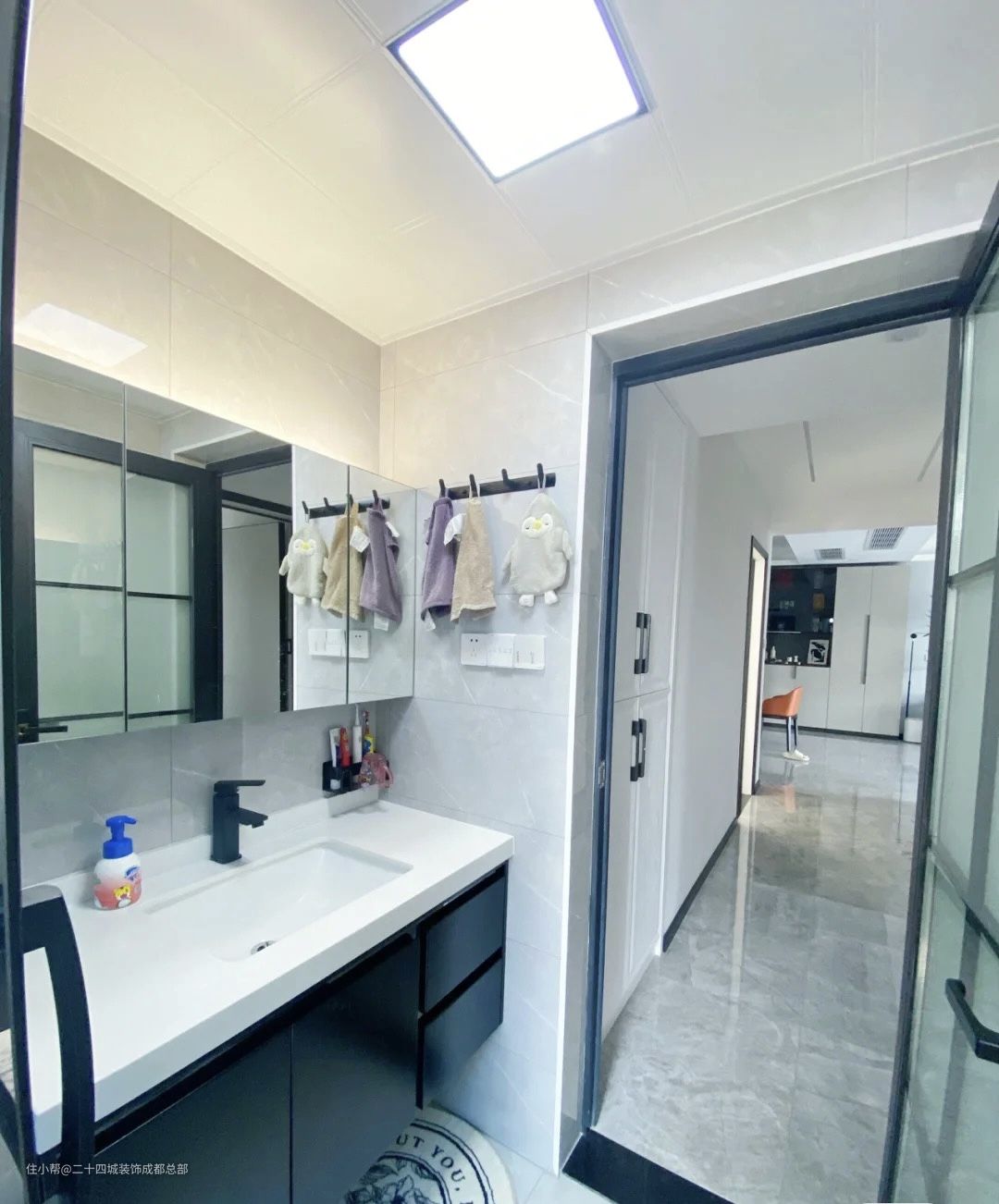 干区设计定制了镜柜,美观的同时非常实用,平时用于收纳护肤与洗漱用品,拿取非常方便。