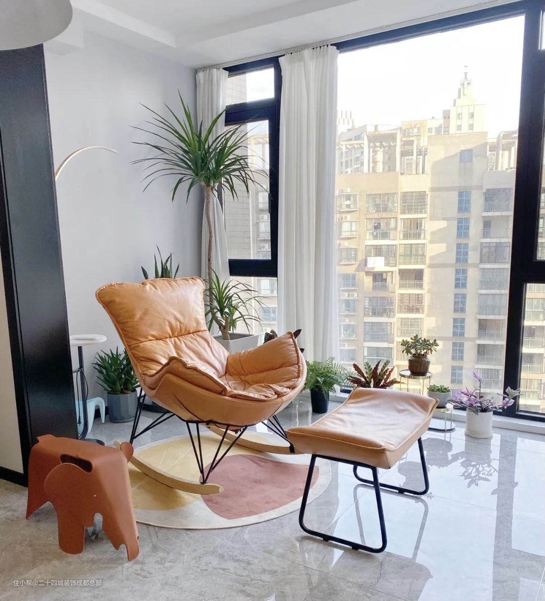 同时设计了休闲摇摇椅,橙色给人以温暖的感觉,坐躺在阳台,沐浴着阳光,孩子们的动态揽收在眼里,放心又惬意自在。