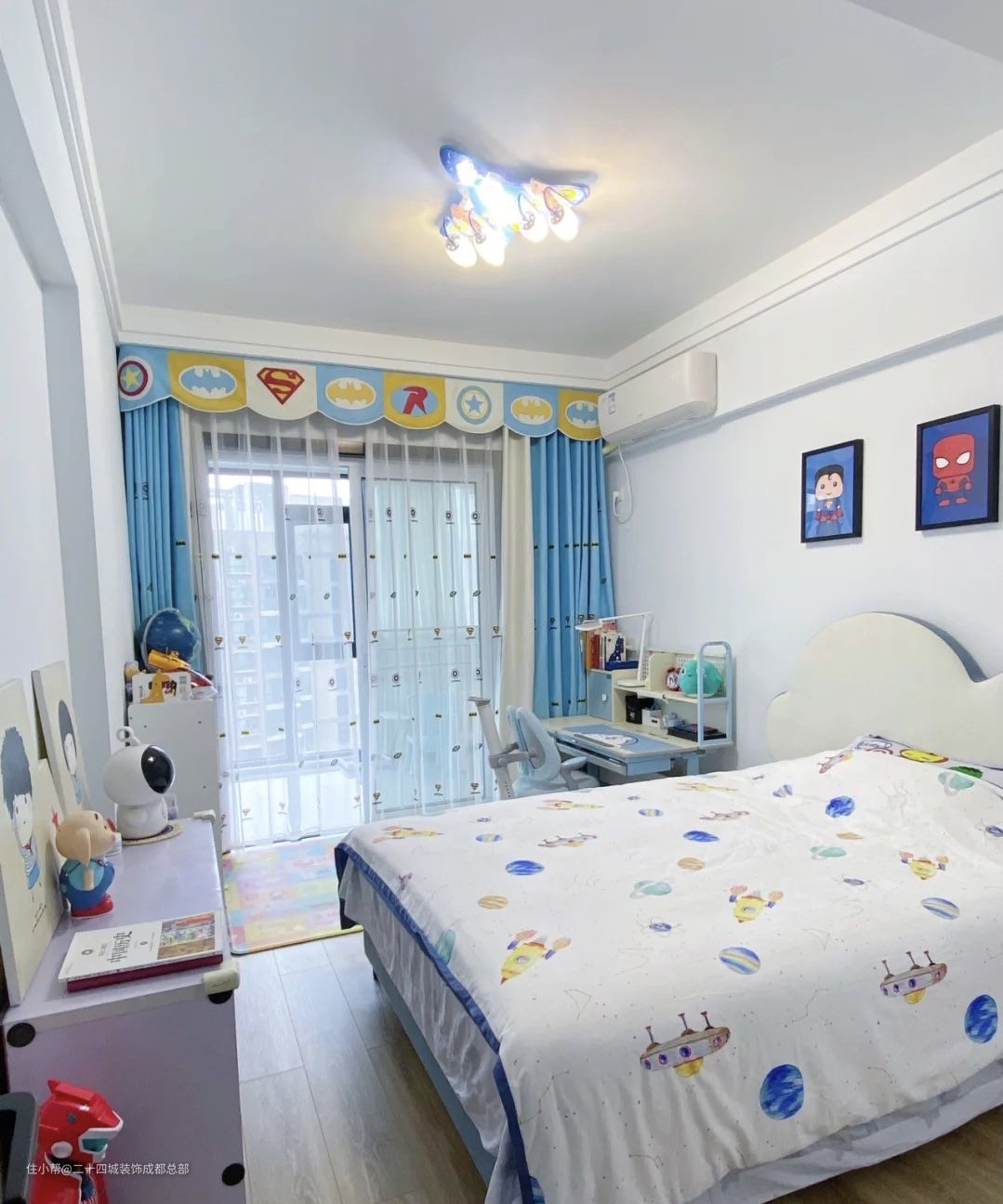 儿童房全屋大白墙,很简约大气,整个空间充满了童趣,设计了飞机模型的吊灯,极具个性,背景墙上挂了动漫画像,很可爱有趣,整屋成为一道独特的风景线,设计了儿童书桌,方便小朋友的日常学习。