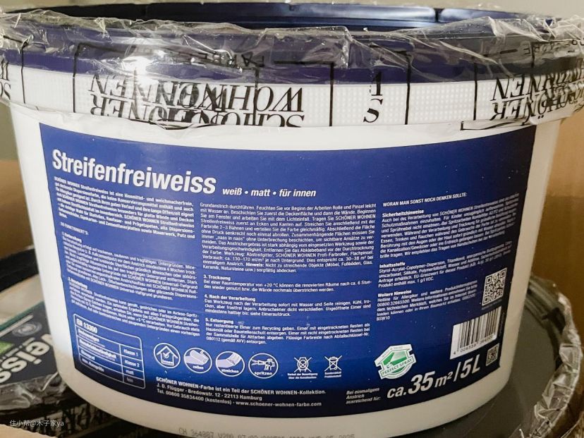 像我自己涂刷的舒纳沃恩,打开箱子可以清晰看到侧身标识写着产地:德国明斯特,有二维码防伪标志,刮开涂层,输入防伪码,可以看到是纯正原装原罐进口漆,同时专门去国外网站看了看是和德国同步的,瓶身还有蓝天使认证和绿色无添加认证。