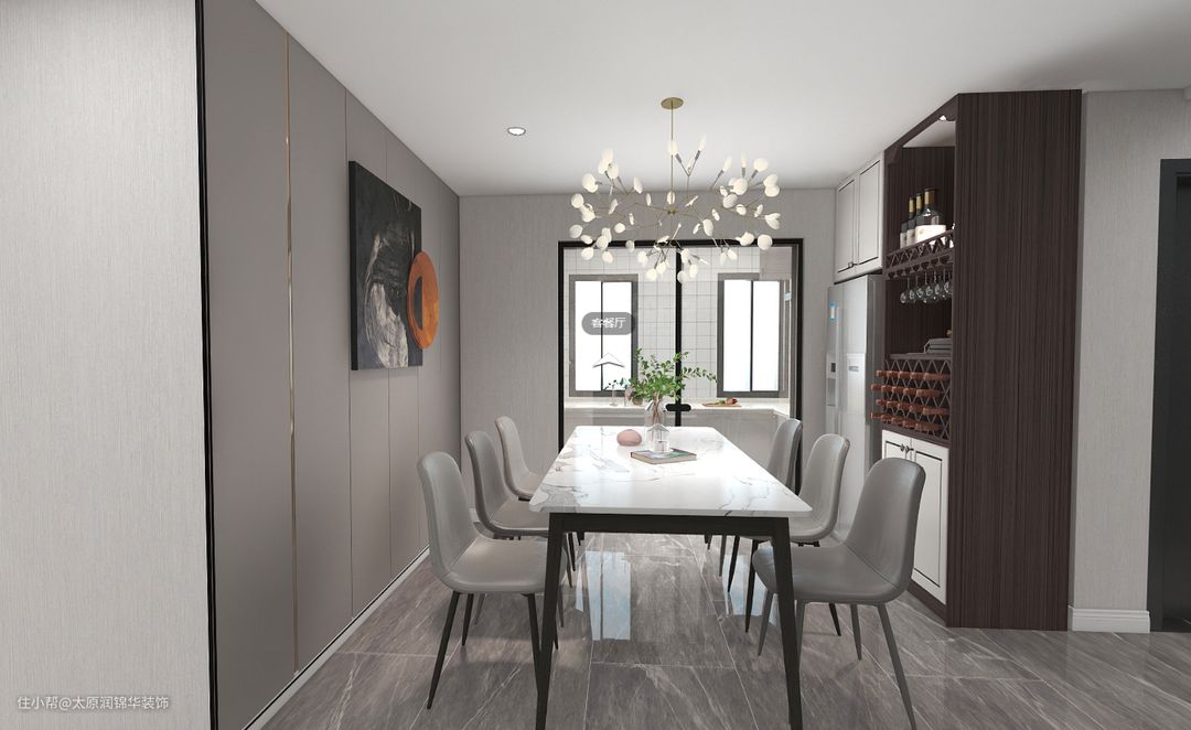 餐厅设计墙面的转角处设计黑色贴面,让整个墙面立体感更强,墙面上的壁挂突出空间层侧感,对面是一个立体式柜子,用来放餐具等物品,餐桌是一个白色大理石长方形设计,凳子继续沿用了墙面的颜色,具有统一协和性,桌上的绿植作为点缀,彷佛置身于大自然的感觉,上方的白色鳞片水晶吊灯既美观又高级,营造了温馨舒适的氛围。