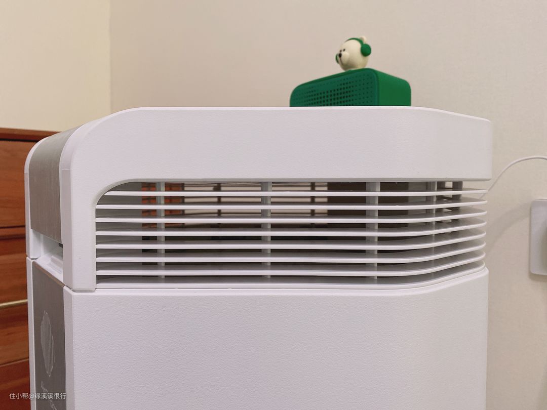 ▲比较瞩目的还有机身顶部的环绕型出风口,从面积上看,出风口格栅环绕一圈,面积大,自然出风量大,净化效果也就好。