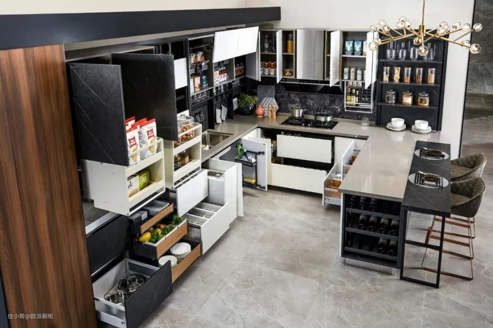地柜最好设计成抽屉式的布局,并利用分隔组件优化内部收纳,这样的分隔件模块化收纳方便,取放便捷。像今年的橱柜新品《神秘园》,就是三层抽屉拉篮结构,收纳功能十分强大,极大地提高空间利用率。
