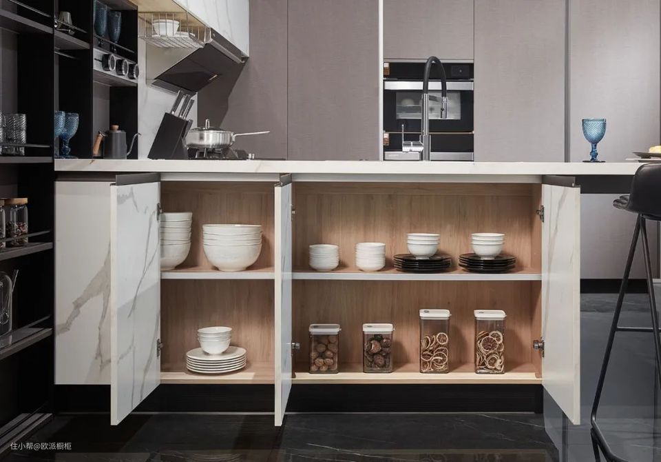 橱柜内部的收纳空间很大,可以额外添加几层开放架做好多层收纳整理,物品摆放更加有序,美观又实用。同时还能打破封闭柜体的沉闷感,增加空间层次感。