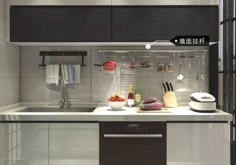 除了考虑操作是否顺手,还要根据物品的重量进行收纳分配,在立体空间布局中,遵循“上轻下重中常用”的收纳原则。如吊柜存放比较轻便的不常用的物品,体积较大的物品适合放在地柜中,而台面应该放置最常用的物品,伸手就能拿取。