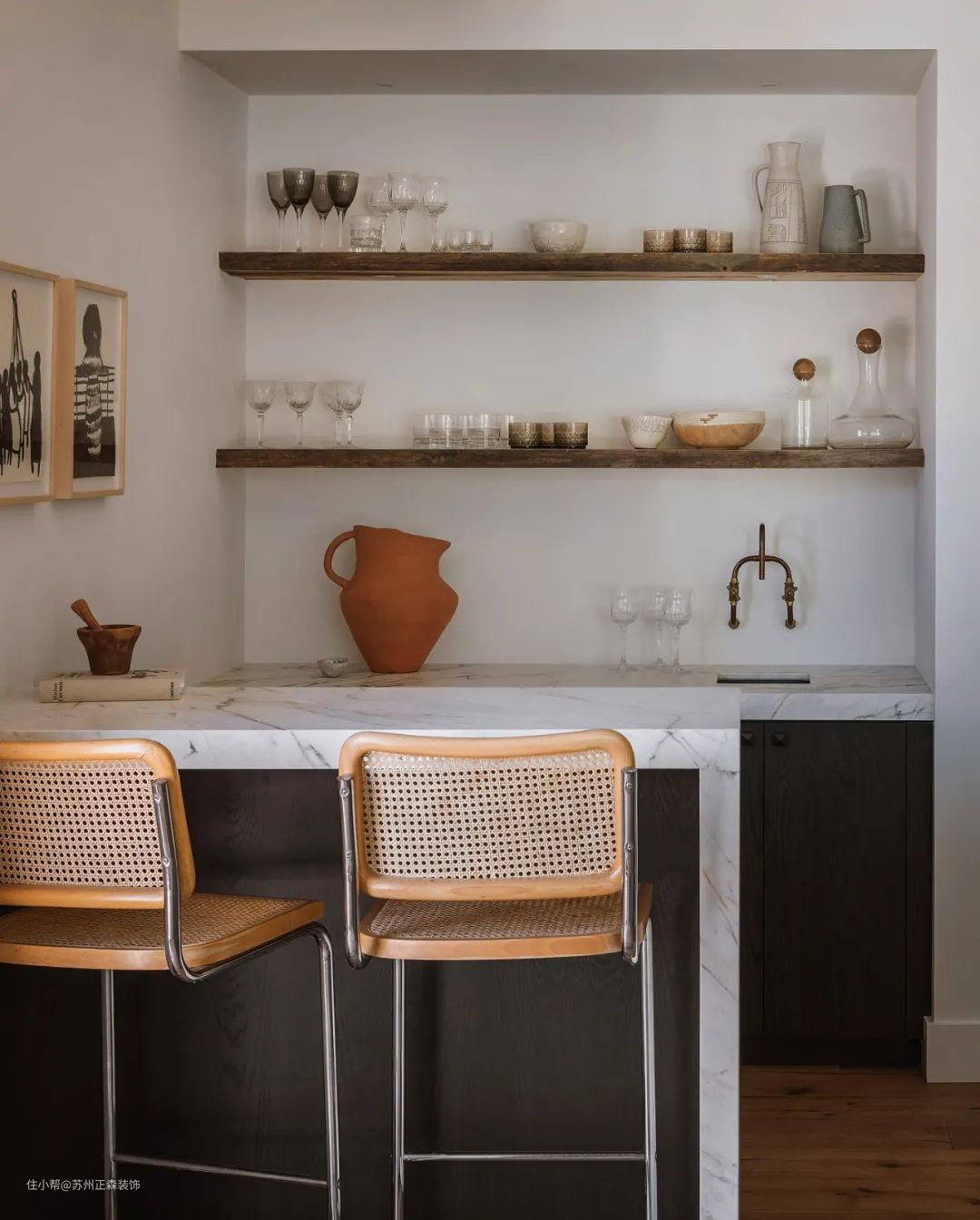 高雅的原木桌凳与储物柜,透过其表面的纹理深浅差异,柔性塑造原生的粗犷美感。
