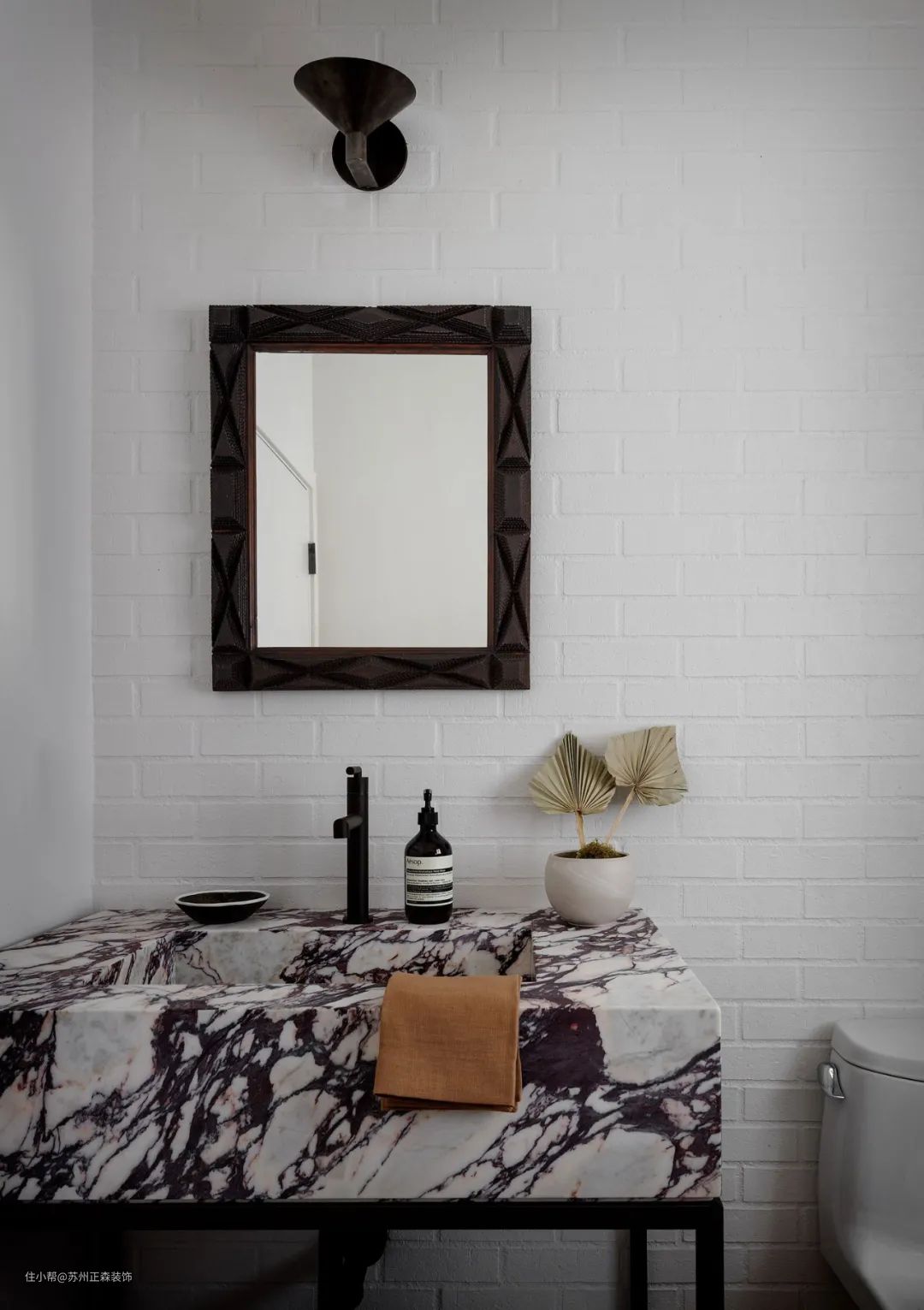 金属、大理石、陶瓷、原木以不同的形式切入到卫浴空间,材质丰富层次,让小小的空间中也能充满优雅高级感。在本案中,整体以低饱和度的色彩为空间基调,体现了舒适之外的高级感,打造了一个远离纷扰的温柔乡。