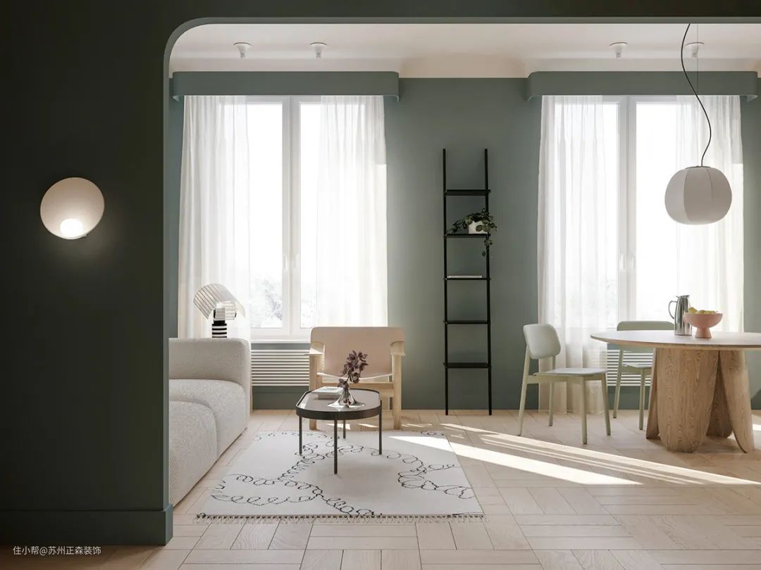 ▲入户原来的大开间设计师认为有些浪费,于是在一侧定制了弧形的柱体,内部为储物量丰富的衣帽间,木质材料的纹理与色彩搭配森林绿的墙面,都显得自然且清新。