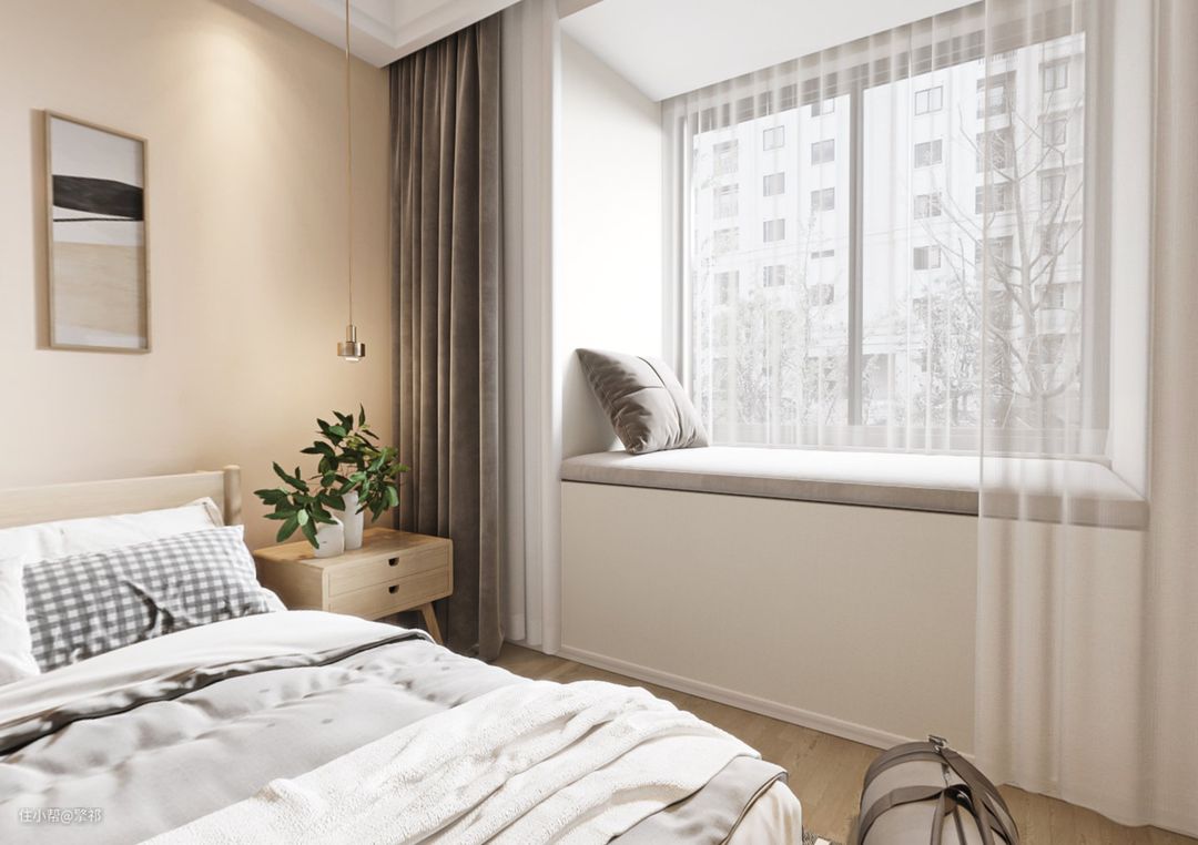 木地板,木色床头柜,灰色窗帘和了杏色墙面,在房间周围营造出宁静的视觉流动。