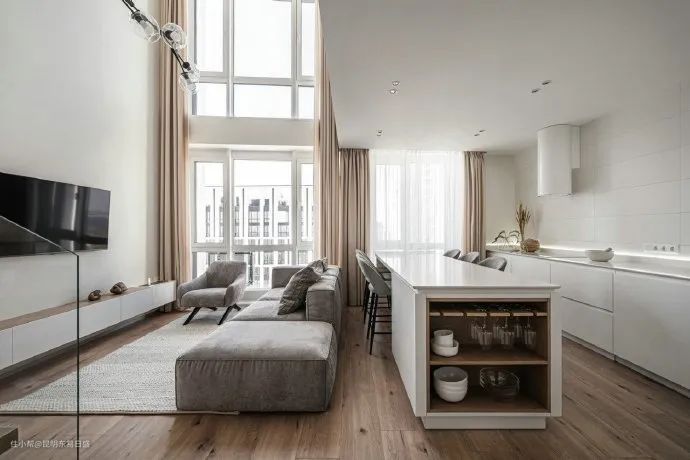 窗外风景好,坐在沙发上可以看风景,有种“面朝大海”的感觉,这样的户型如果沙发依然靠墙摆真的是暴殄天物。