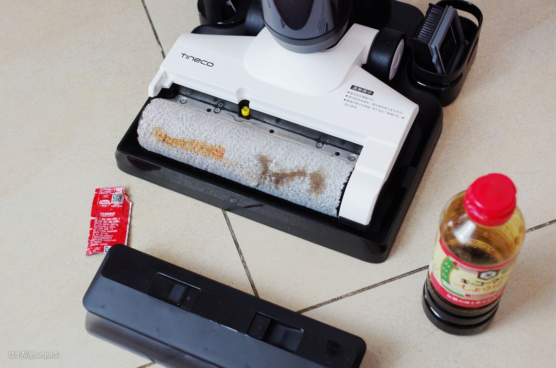 打扫完成好,清理机器也是一件麻烦的事情。如果洗地机能够把自己洗干净,那可就太棒了。为了增加难度,我在地刷上多倒上了一份番茄酱和酱油,来试试看芙万2.0slim的自清洁能力怎么样。