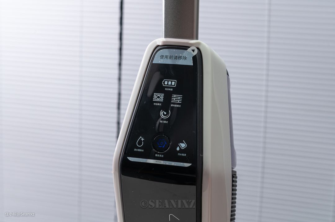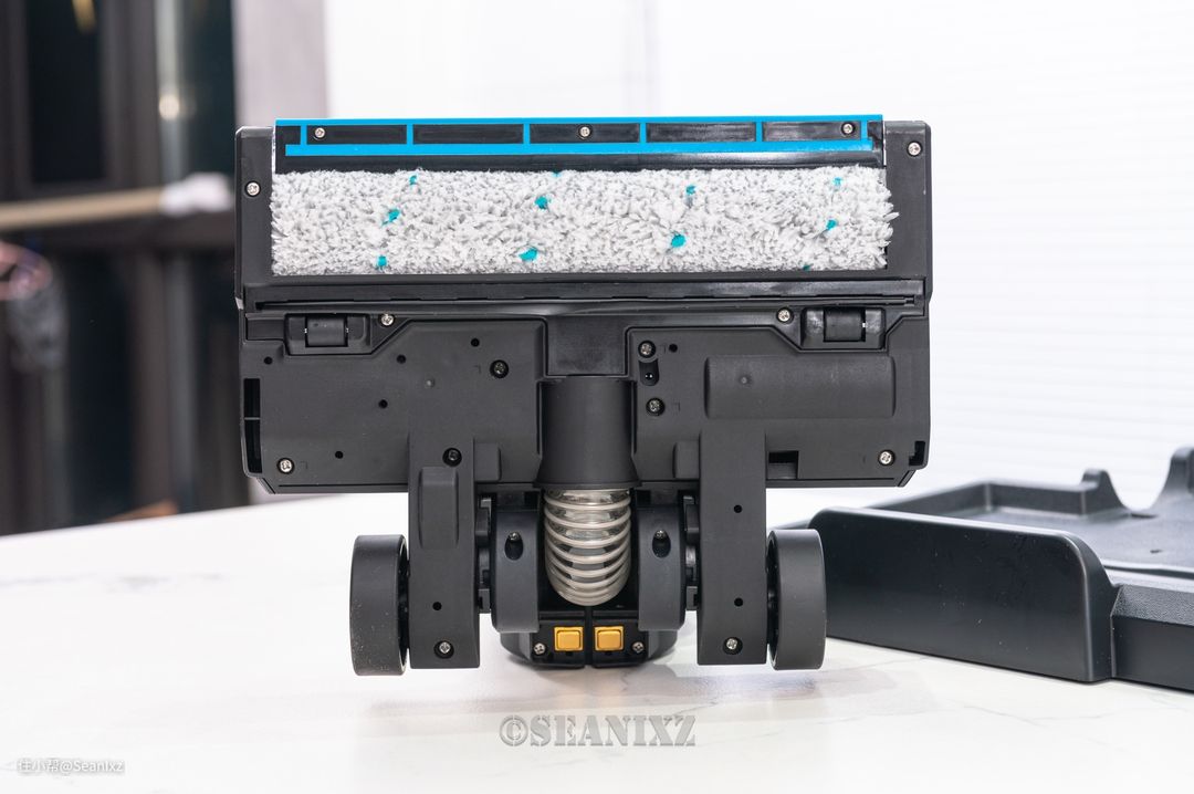 把手部位是开关和模式切换按钮,底部食指位置带有一个扳机式的喷水开关,可以根据需求控制湿拖水量,不需要喷水时的状态也相当于一台旗舰级别吸力的吸尘器。