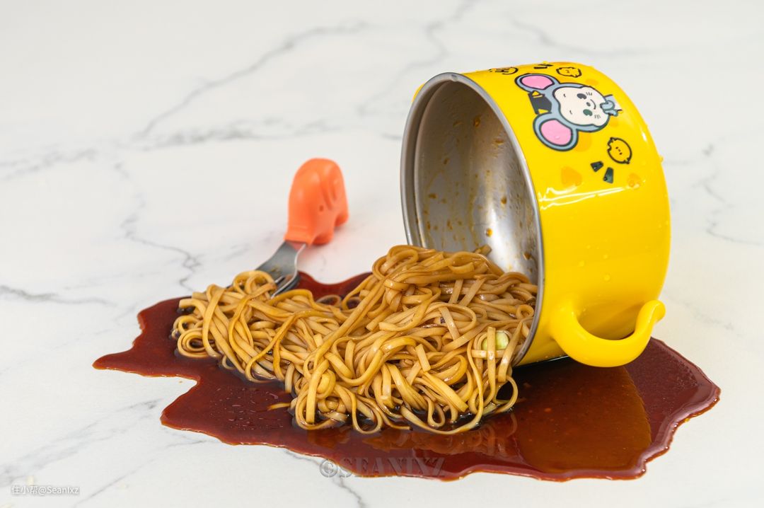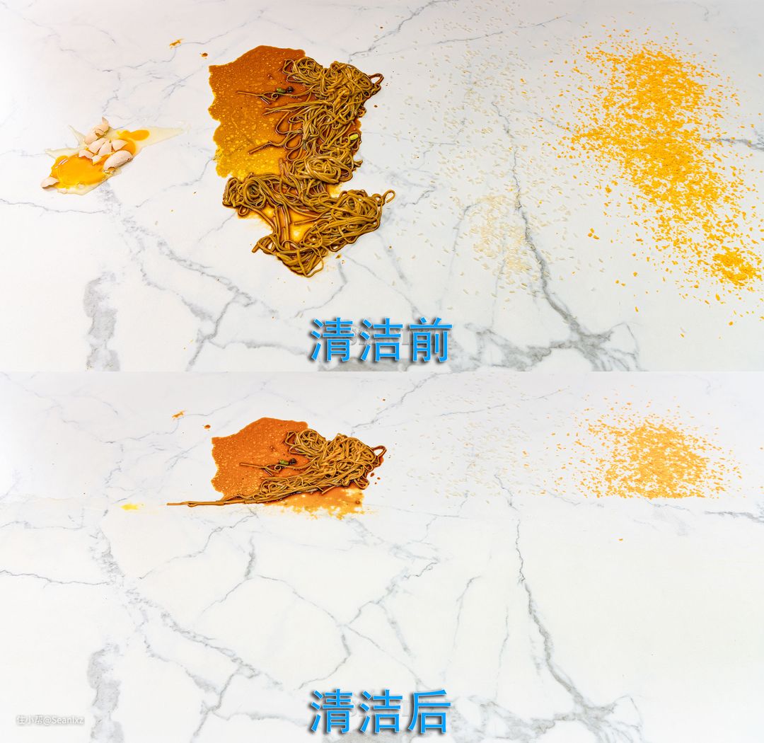 粘有油汤的面条可以代表日常厨房餐厅掉落在地面的各种重油污的餐厨垃圾,日常孩子打翻到地面上的饭菜都是这类难清洗的情况