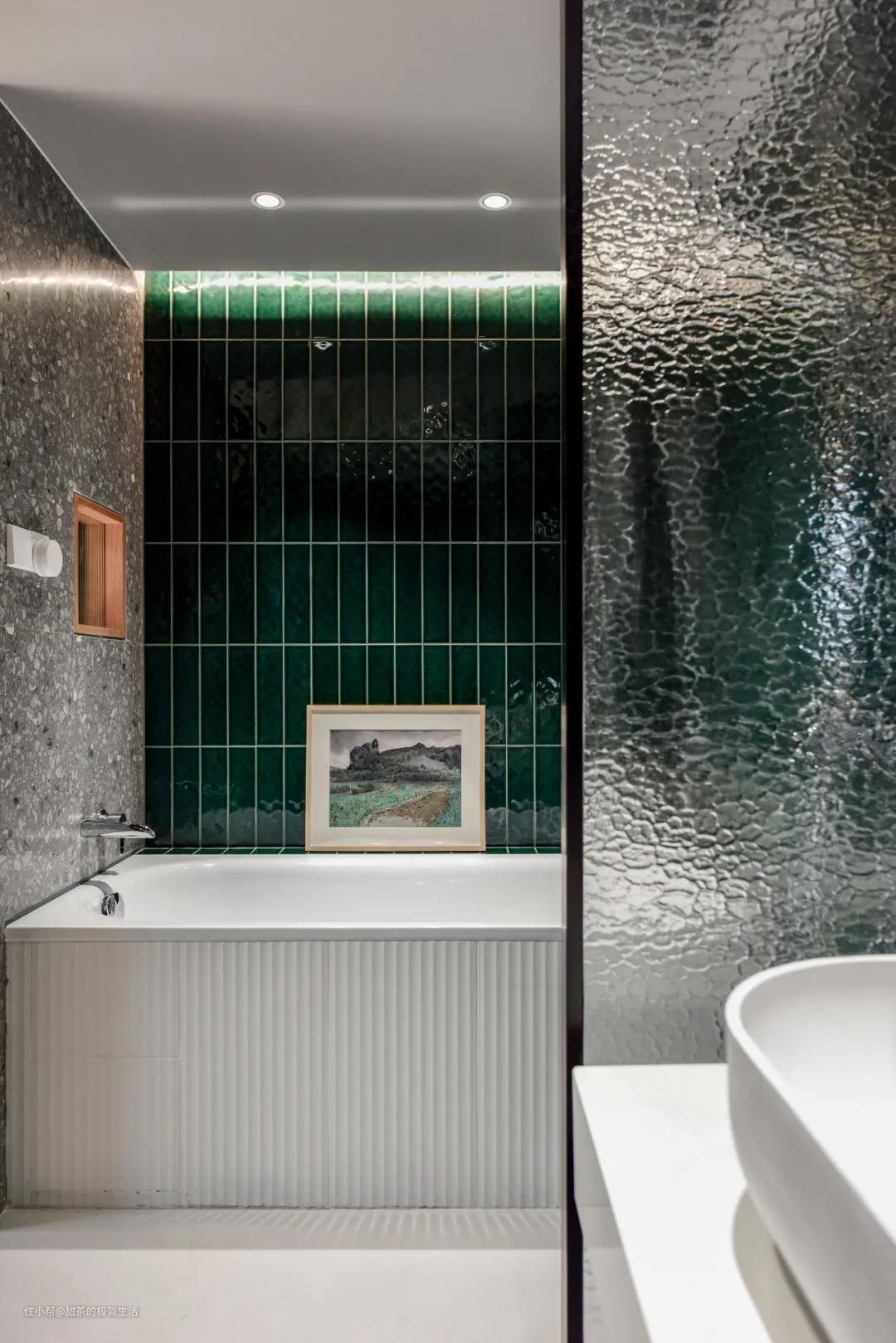 设计师把主卧的衣帽间改为了主卫,内部布置了大浴缸,墙面用墨色的釉面砖和水磨石大板做点缀,质感十足。