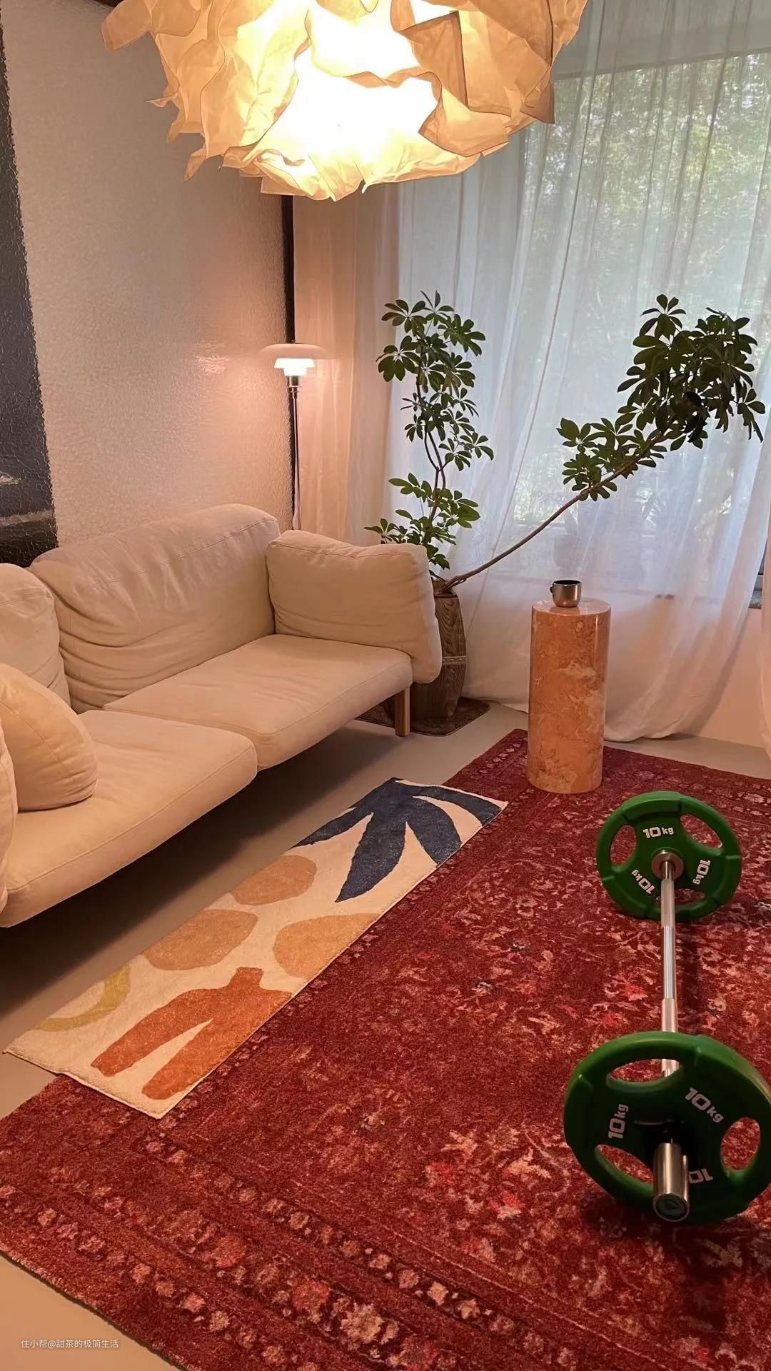 男主特意在客厅铺了一张民族风红色大地毯,不仅起到了装饰空间的作用,到了晚上这里也能变成居家健身区。