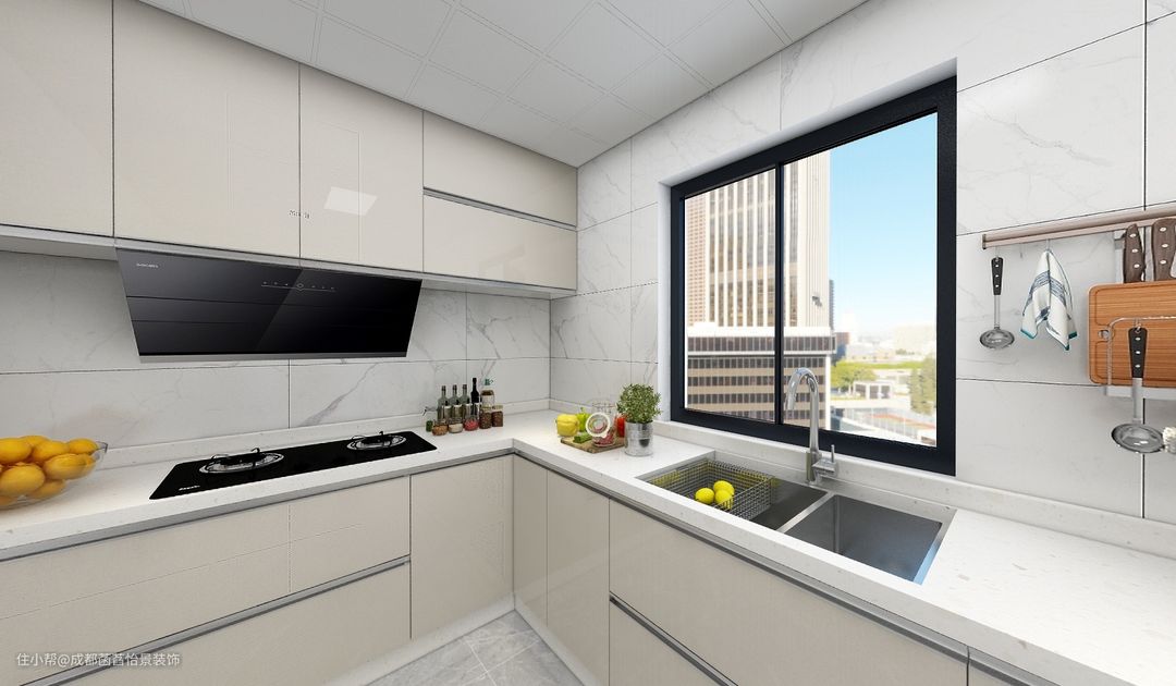 L型的厨房操作台面,奶咖色的橱柜门,超强的收纳能力,为爱下厨的家人提供了一个宽敞的展示空间。