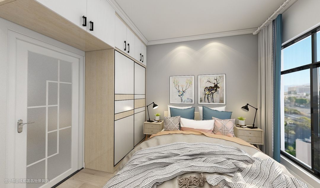次卧连接着落地采光门窗,为卧室引入充足自然光,床品的一抹灰色与窗帘呼应,使身心灵顷刻舒缓放松。