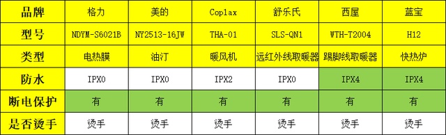 安全性上主要是防水效果,断电保护和以及是否烫手。其中防水效果有直接的数据,踢脚线取暖器和快热炉等级最高,达到了IPX4可以放在浴室使用。暖风机其次防水等级为IPX2,而剩下三款都不防水。