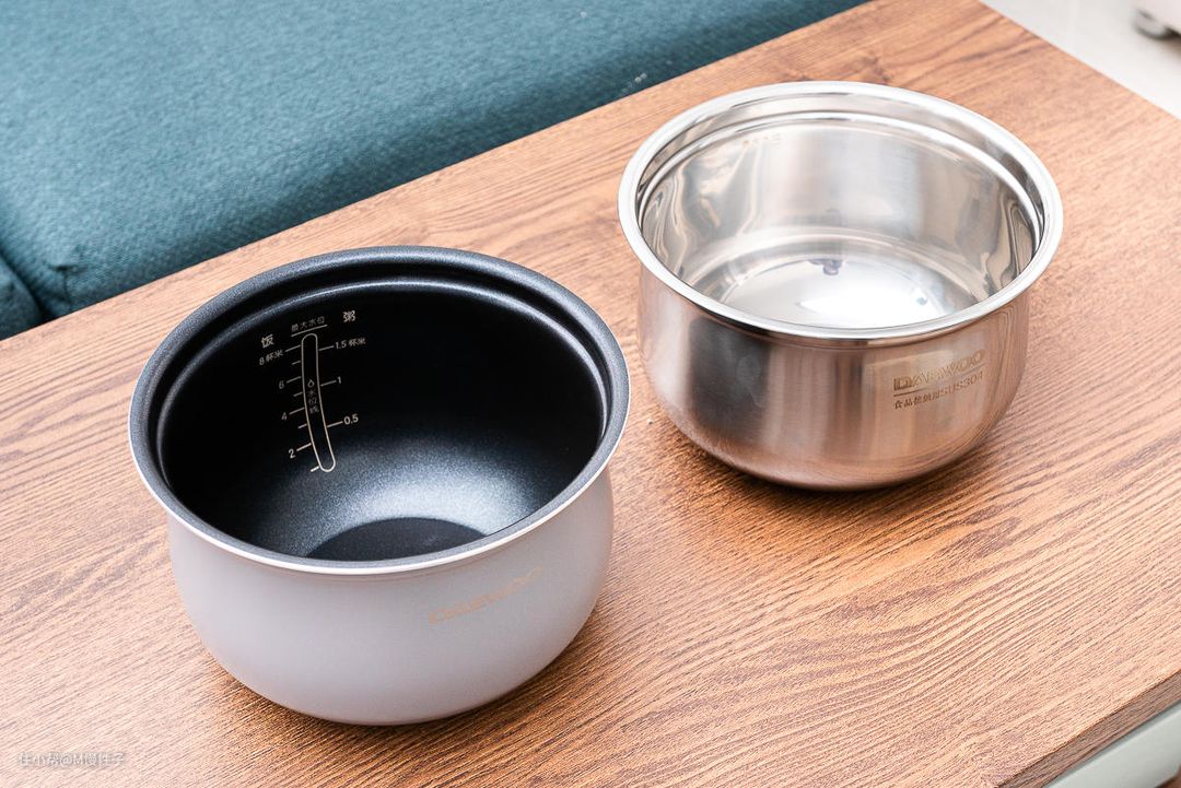 ▼这款配了两个内胆,一个有涂层的用于电饭煲模式煮饭,一个304不锈钢的用于电压力锅炖煮,这样在炖煮一些有锋利骨头的排骨等的时候就不担心划伤涂层了。