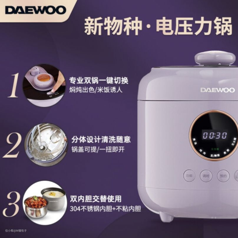 ▼最近在逛某宝时看到了一款大宇的既能当电压力锅又能当电饭煲的锅,同时也是分离锅盖设计,双内胆有不锈钢内胆。正好相对于地弥补我之前电压力锅连体盖有死角、电饭锅不能炖煮、需要煮豆饭的需求,并且价格也和我老款压力锅价格差不多,五六百的样子,价格也不错,入手了一台,来分享下体验吧。
