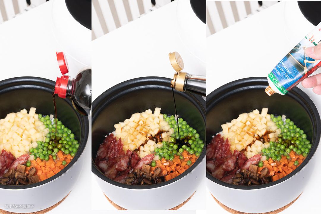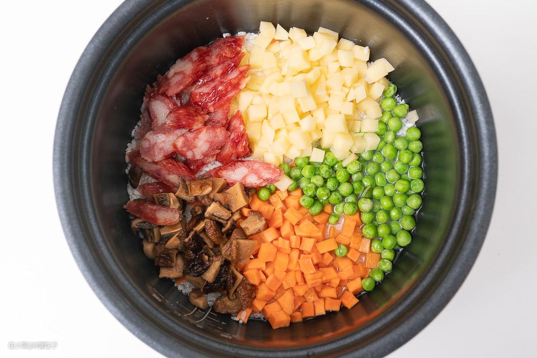 ▼最后来试试电饭煲模式吧, 做一个快手煲仔饭,3杯米淘洗好后,放入没过米的水泡30分钟,这时候我们可以准备我们的菜,一般没有太多水分、加热后不容易变黄的都可以放入,我放了青豆、土豆、胡萝卜、腊肠以及泡发好的香菇。