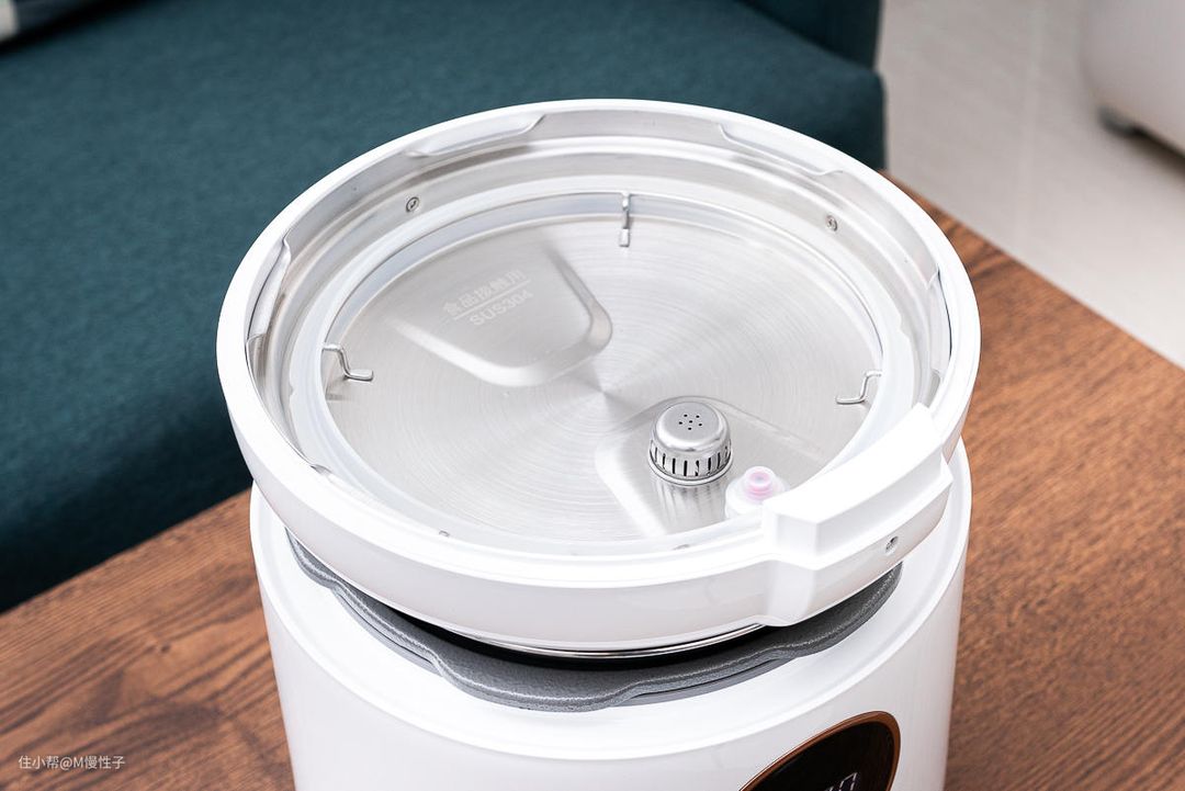 ▼打开后看到锅盖的部分,采用分离式的设计,并且接触到食材的部分都使用不锈钢材质,清洁起来比较方便。