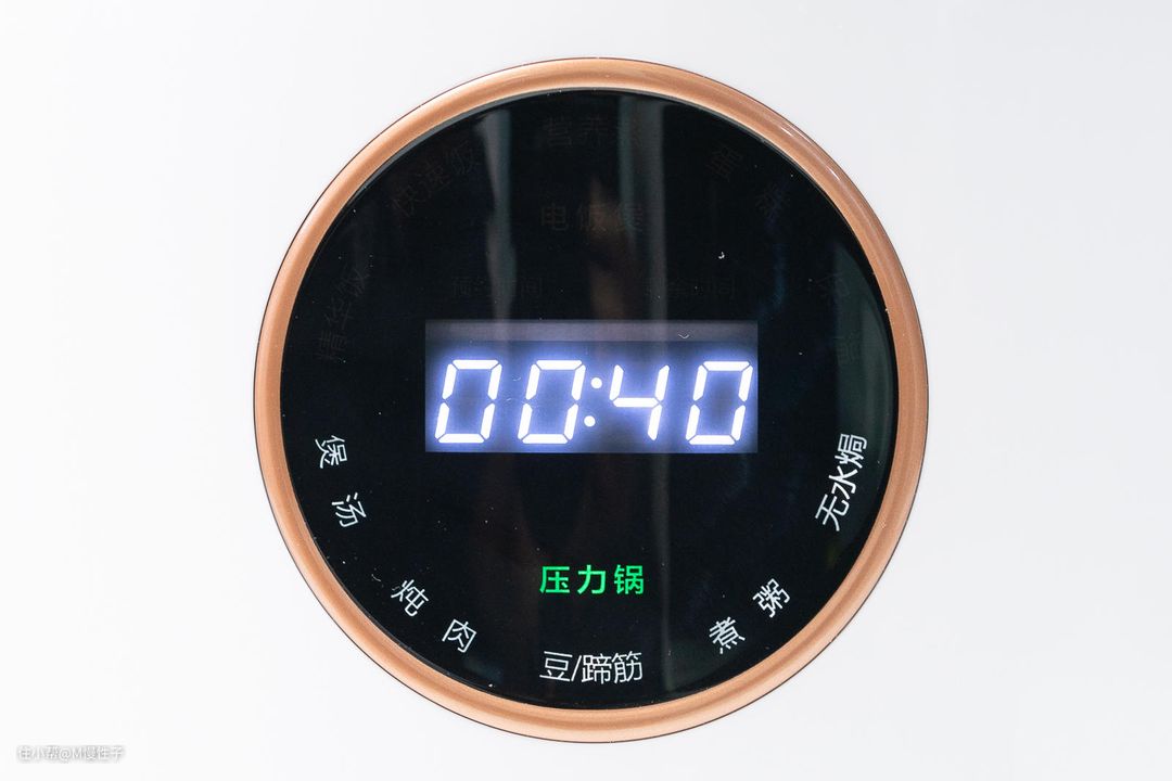 ▼机身前部是控制菜单,当我们拨动顶部的拨钮后,菜单也会跟随变换,上半圈是电饭煲菜单,有四个选项,下半圈是电压力锅菜单,有5个选项。
