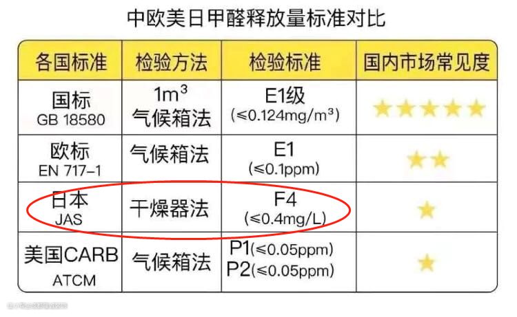 还有,E1级的板材包括现在E0级的板材虽然符合国家的环保标准,但是他的用量是有限制的,用量过大累计释放照样超标。日本的F4星级板材,已经达到了不限用量的水平,也就是说,我们级别更高的ENF级板材,更可以不限用量了,所以全球范围内,有消费能力的,家里面积大的,板材使用量大的,建议使用中国的ENF级板材。