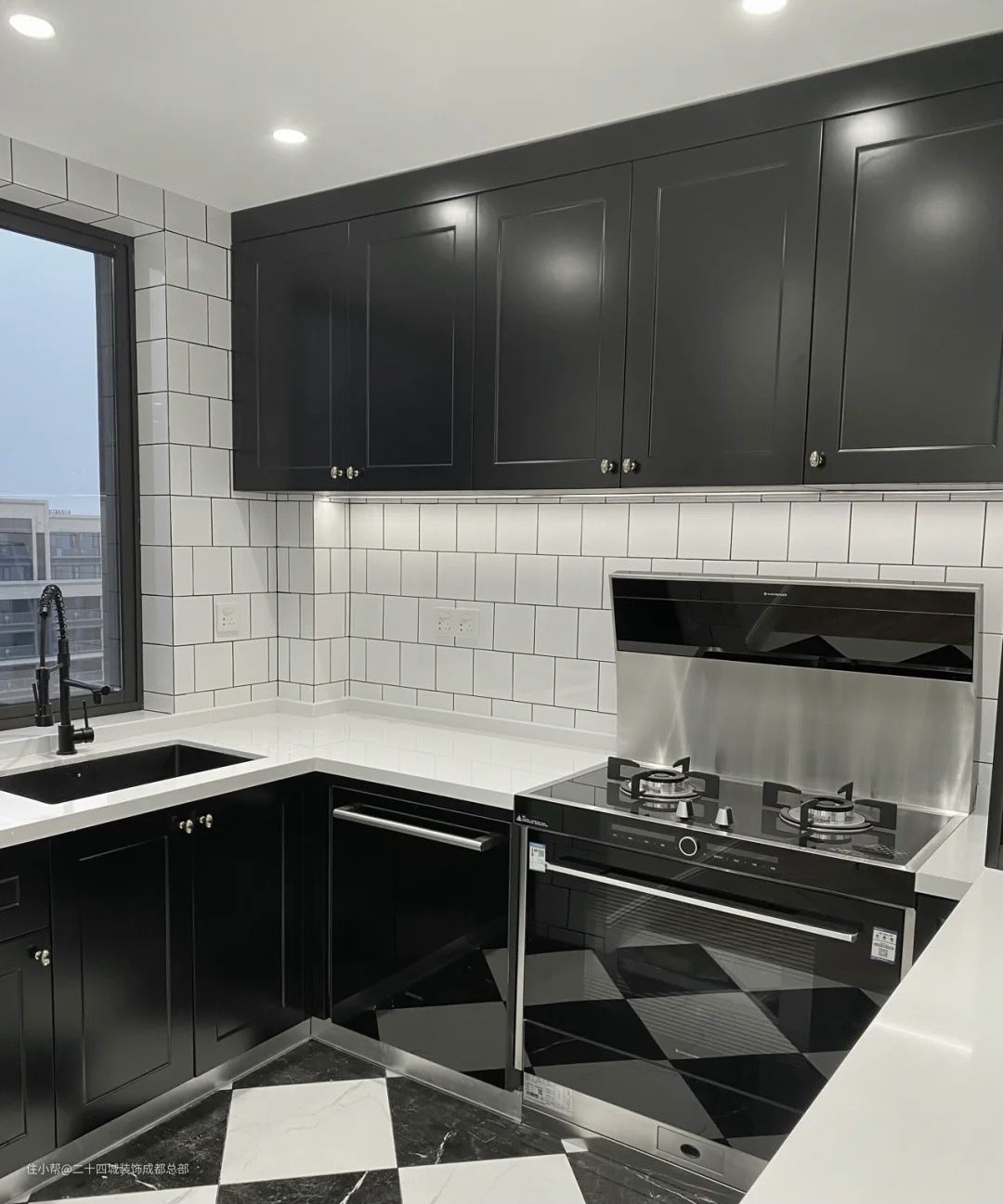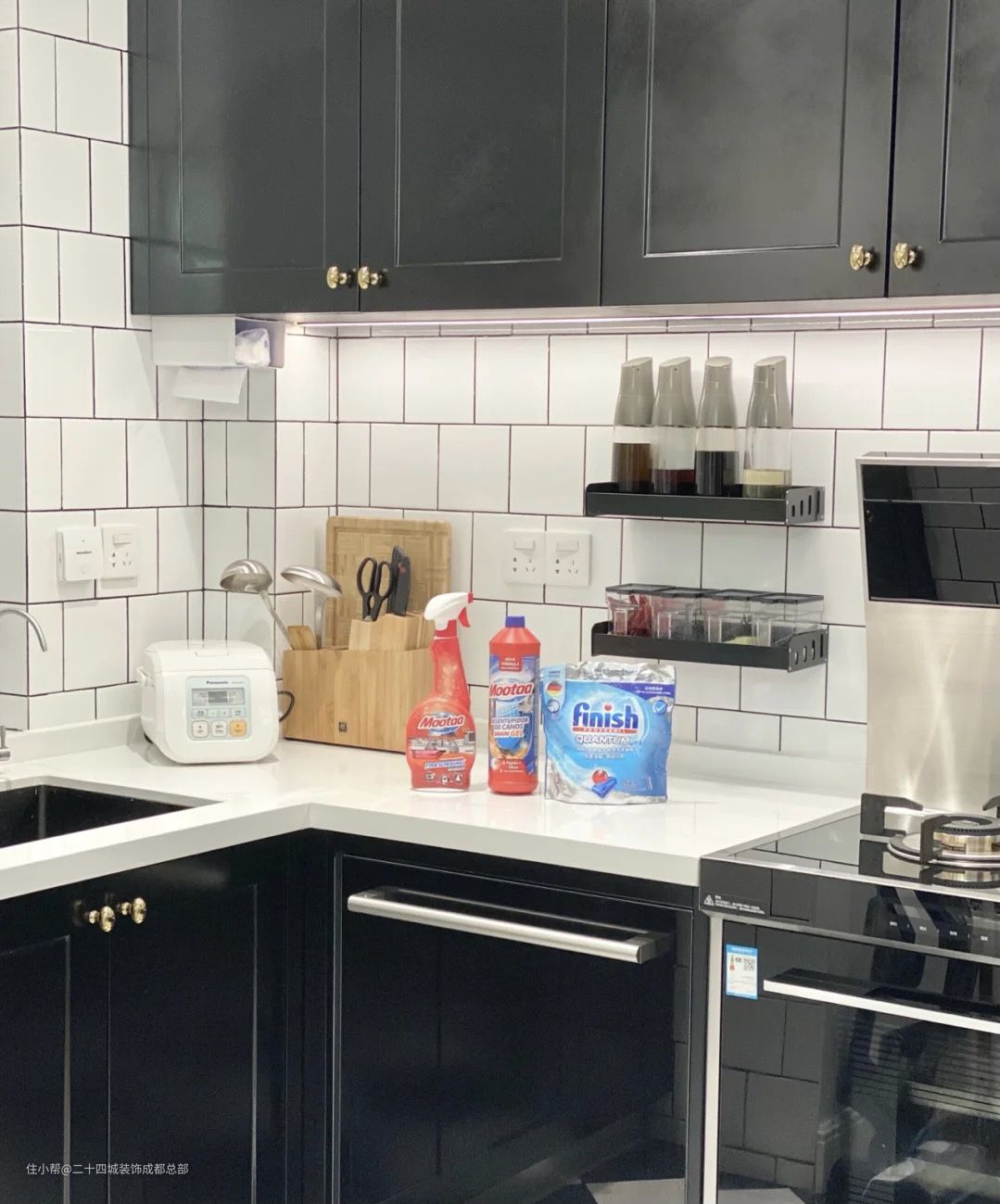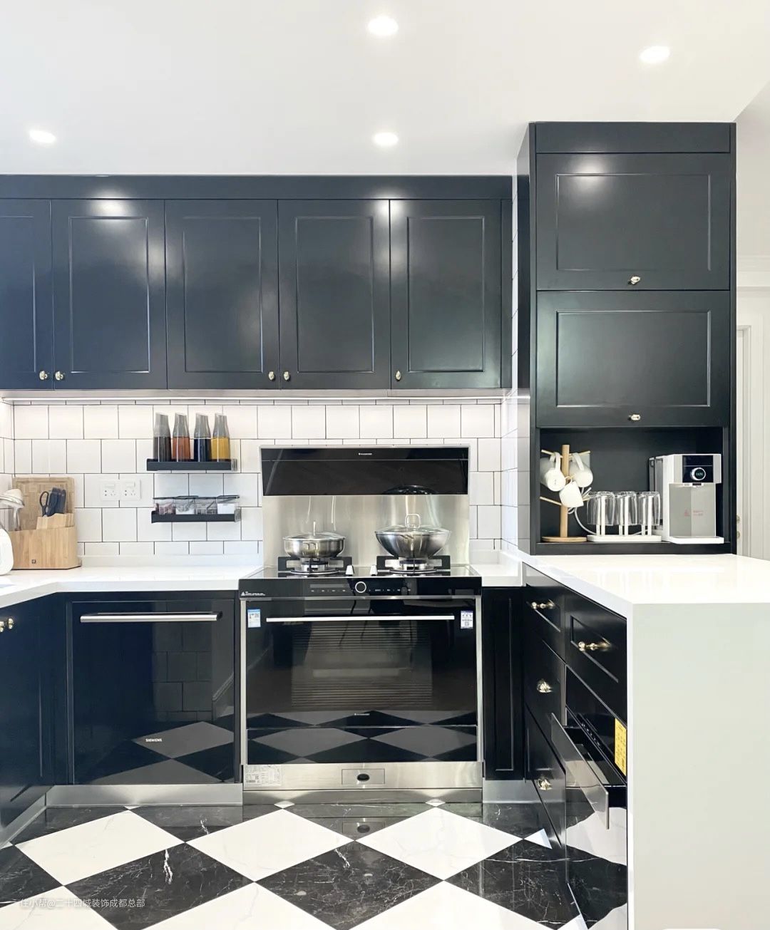 定制了橱柜,黑色的柜门搭配银色的把手,给人以神秘莫测的深邃感,整个空间黑白搭配,干净简约,颜值也很高,增加了厨房的储物收纳空间。