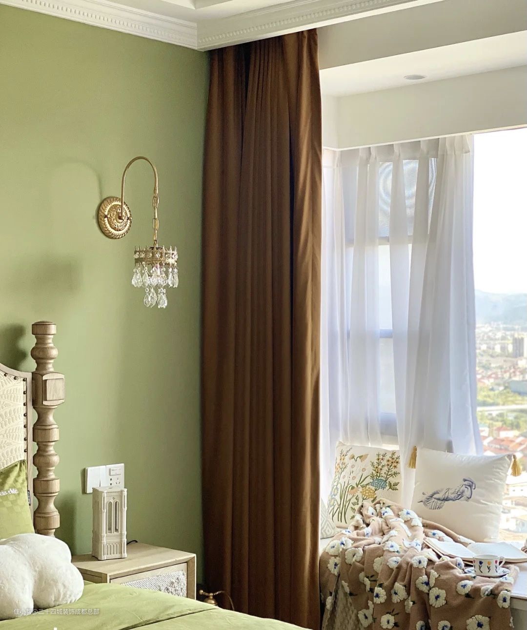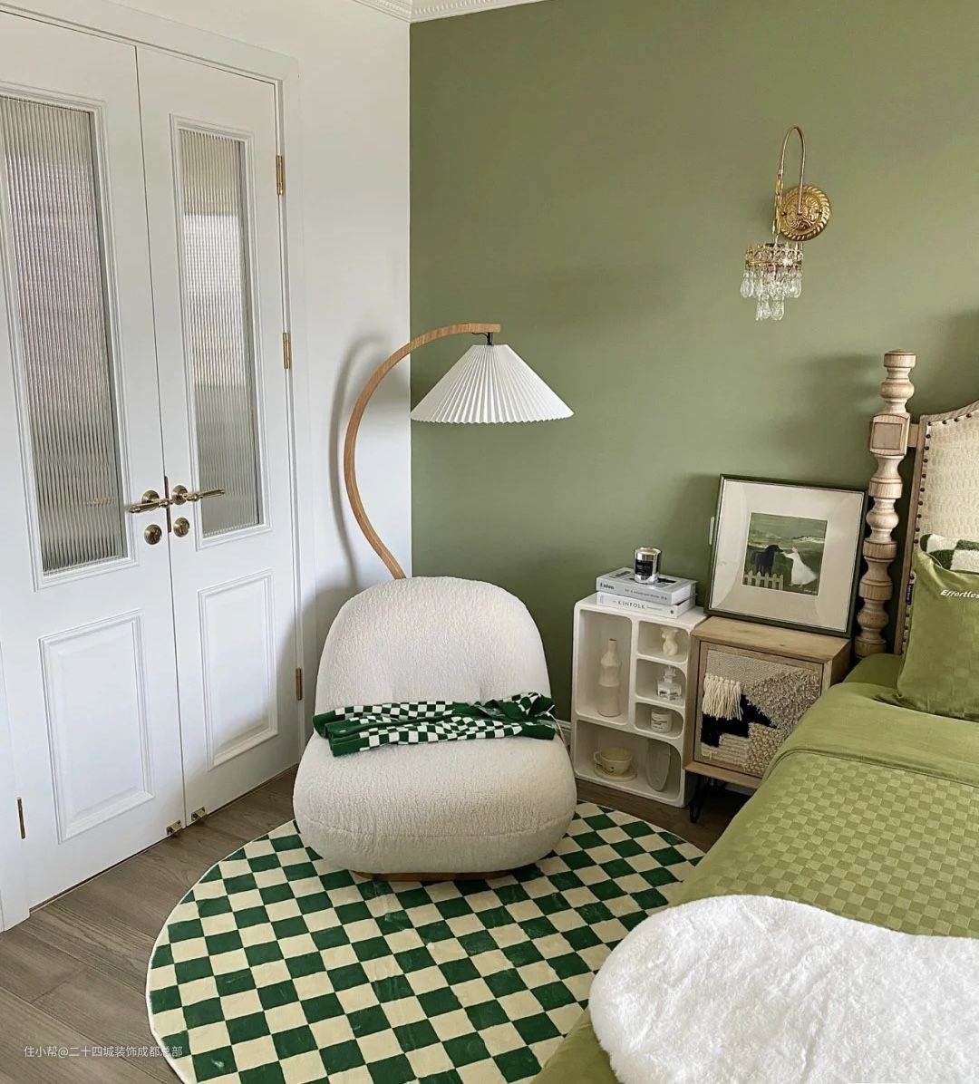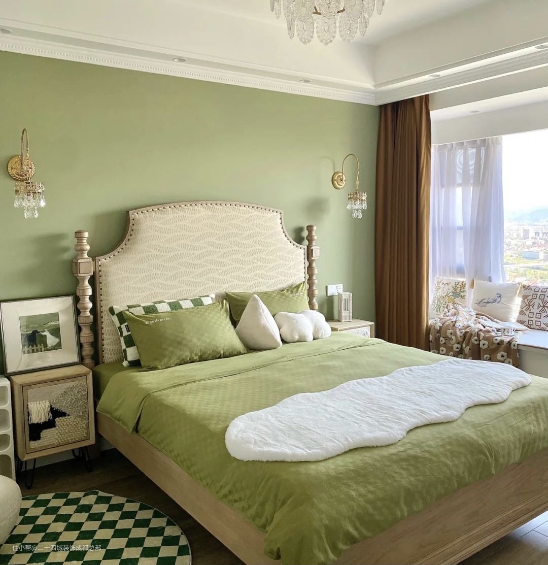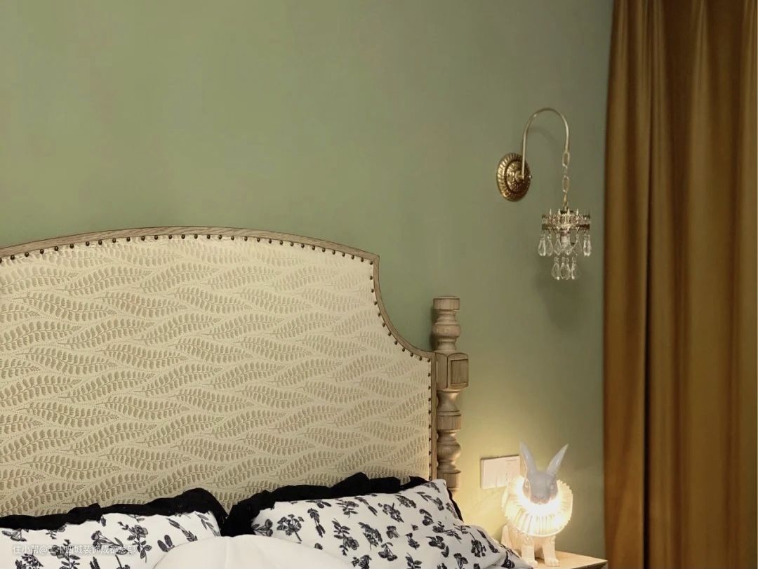 主卧背景墙设计了抹茶绿的乳胶漆,给人以清新、高级的感觉,其他三面都是大白墙,通铺橡木色的木地板与墙漆很搭配,整体蔓延着复古又清新的气息。