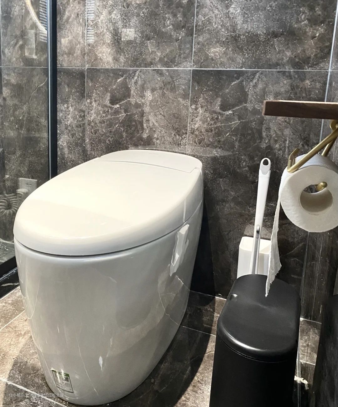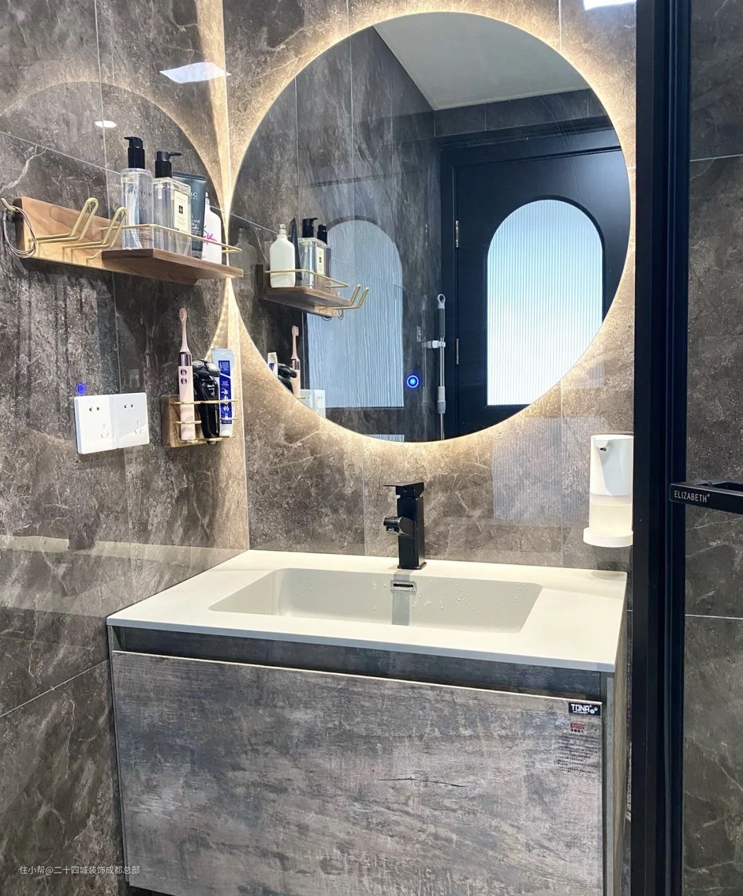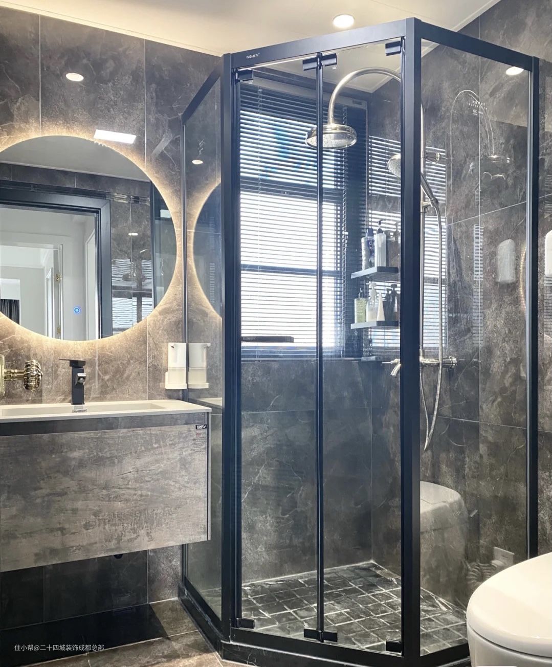 设计了干湿分离,通铺咖啡色的瓷砖,优雅、朴素、庄重而不失雅致,整体深色系的卫生间高级感满满。