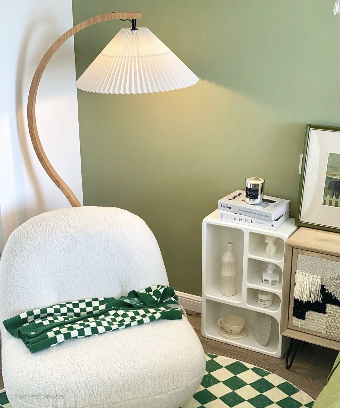 百褶落地灯柔和的灯光,让空间中充斥着温暖的气息,充满了氛围感,设计了白色系的异形简约置物架,独特新颖又简约大方,用于收纳香薰等物品,非常实用。