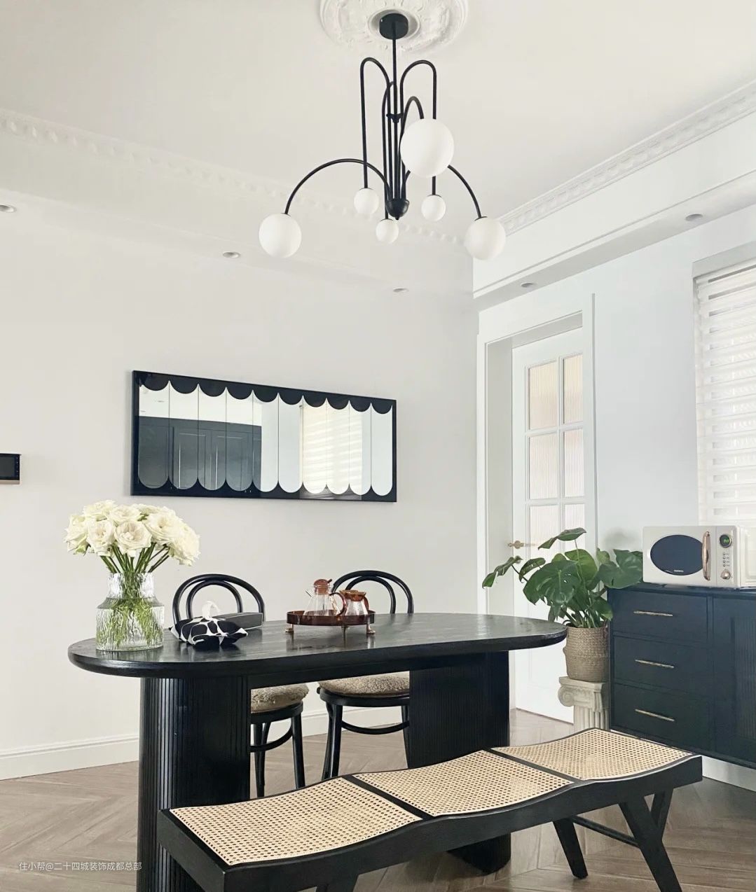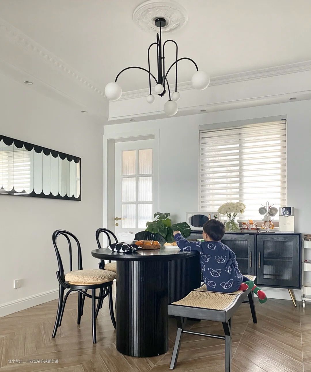 餐桌是经典的法式风格,整体都是实木的,桌面上清晰的木纹非常具有复古感,餐椅设计了不同的三个款式,都是黑色系,很有整体性,加入了藤编的元素,增加空间的温暖气息。