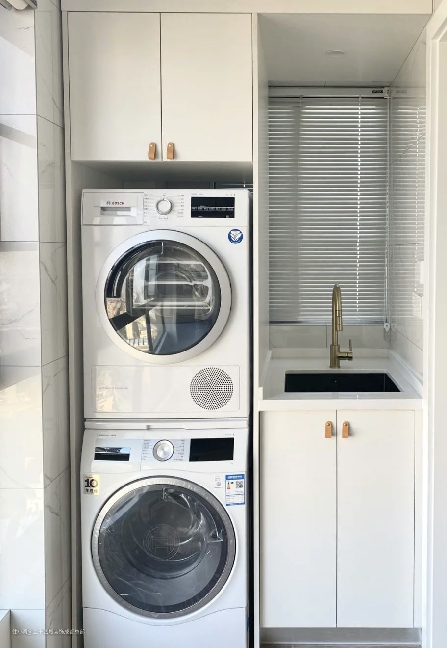 北阳台设计为洗衣区,定制了洗衣柜,预留了叠放洗衣机的尺寸,洗衣机上方的柜体用于囤积洗护用品等,洗衣机旁的柜体用于收纳常用的洗护用品以及工具等,白色的柜门搭配皮质的把手,简约大气的同时凸显质感、高级感。